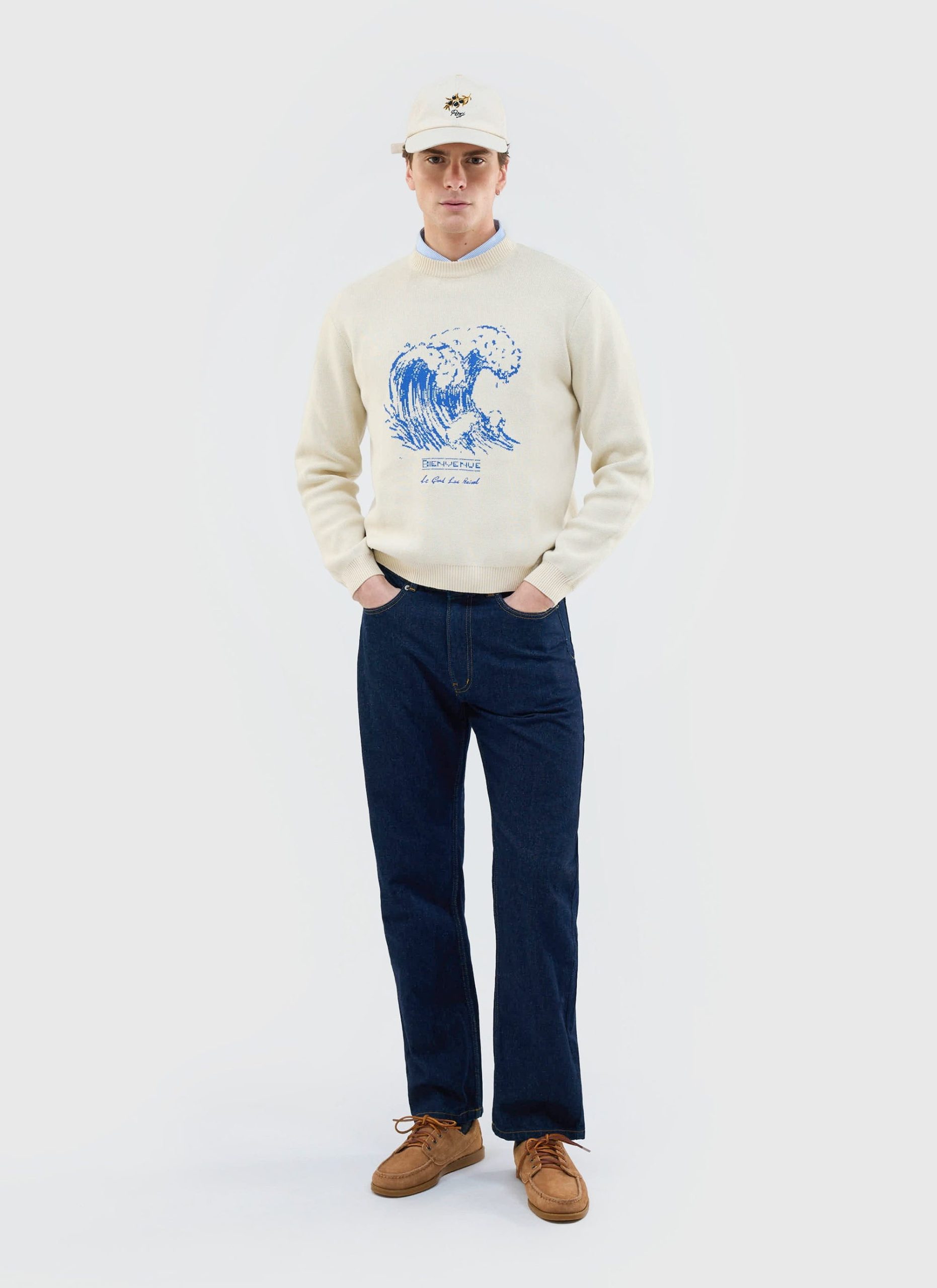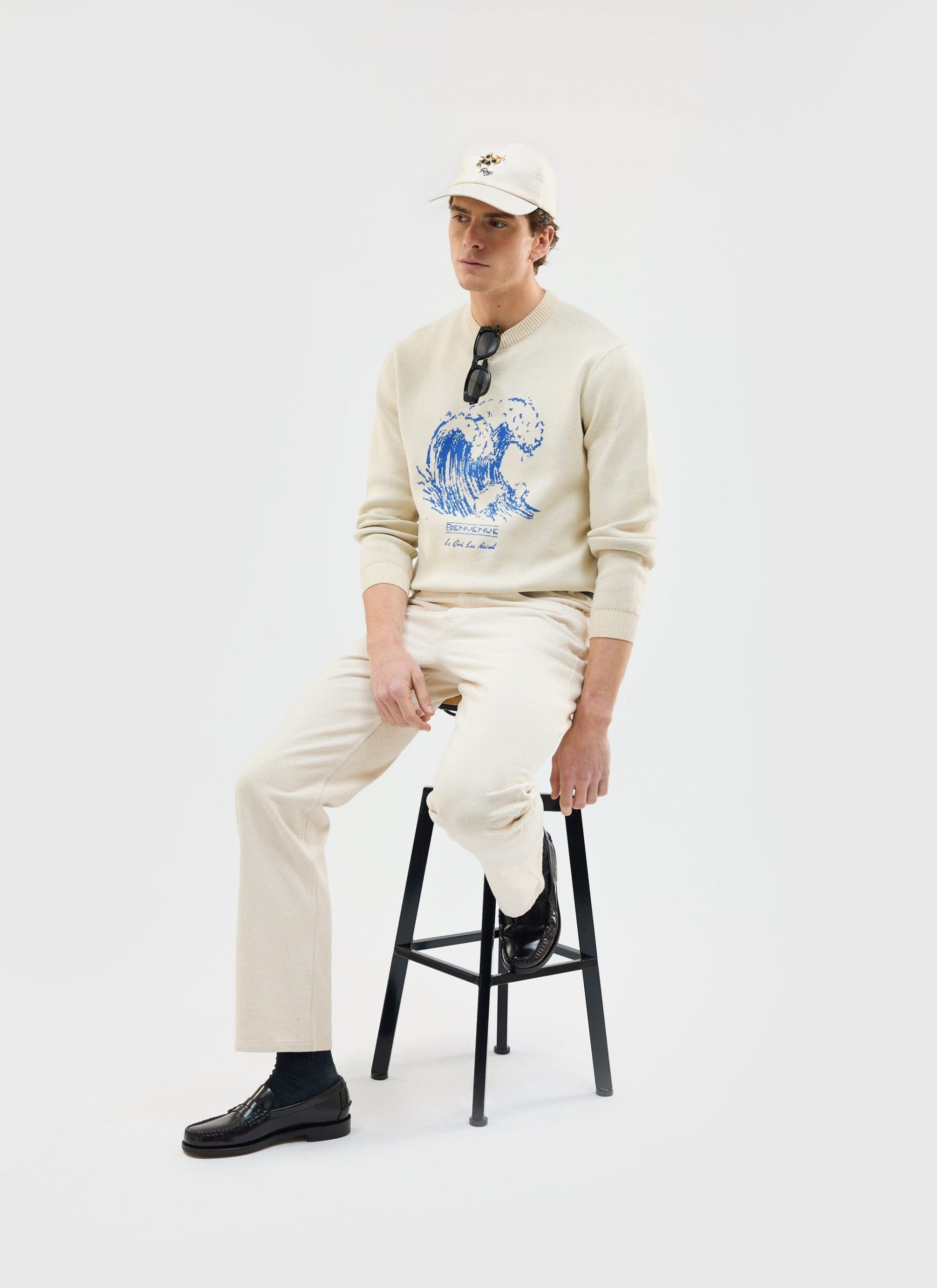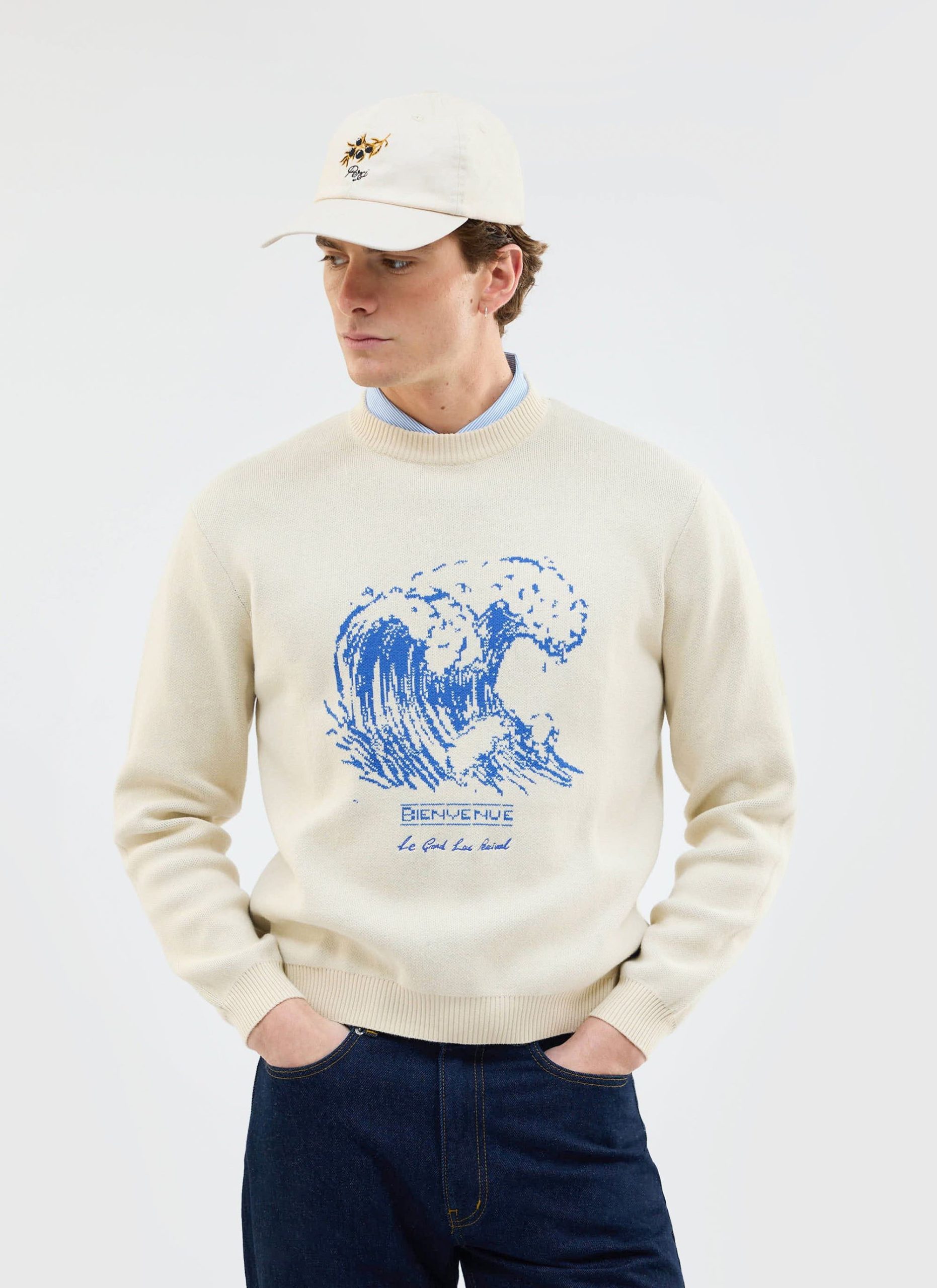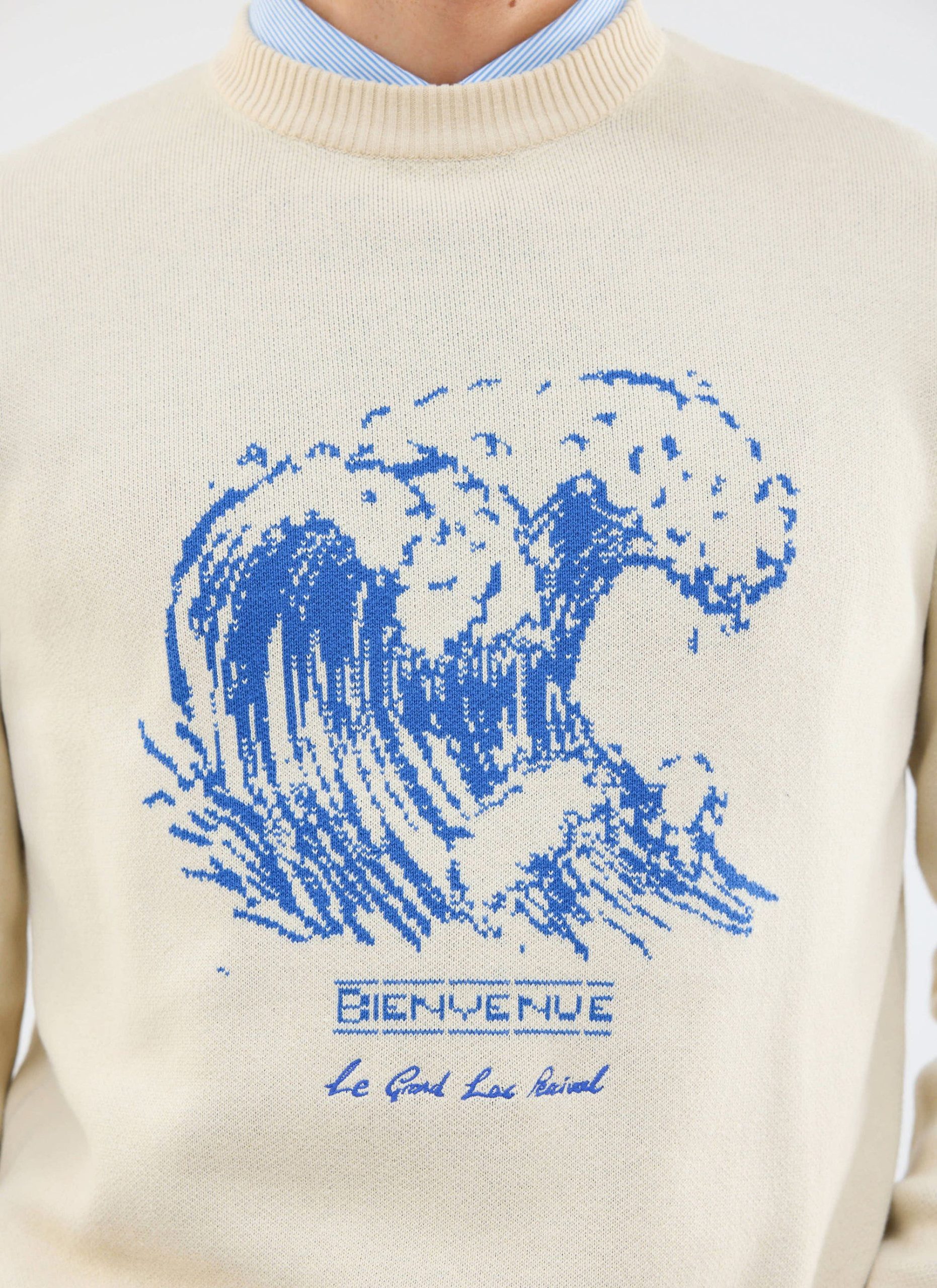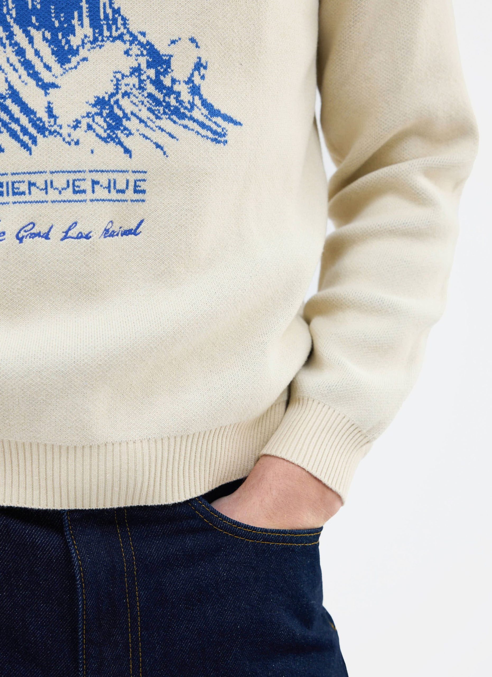 Bienvenue knitted crew neck jumper. Bienvenue, meaning welcome. Welcome to summer friends. Part of the Percival summer season, Le Grand Lac – the big lake, the big summer, seaside, no lakeside. This knitted jumper, knitted in limited quantities, is a perfect graphic knit and feeds into the summer theme. A classic fit, relaxed, it is summer.
