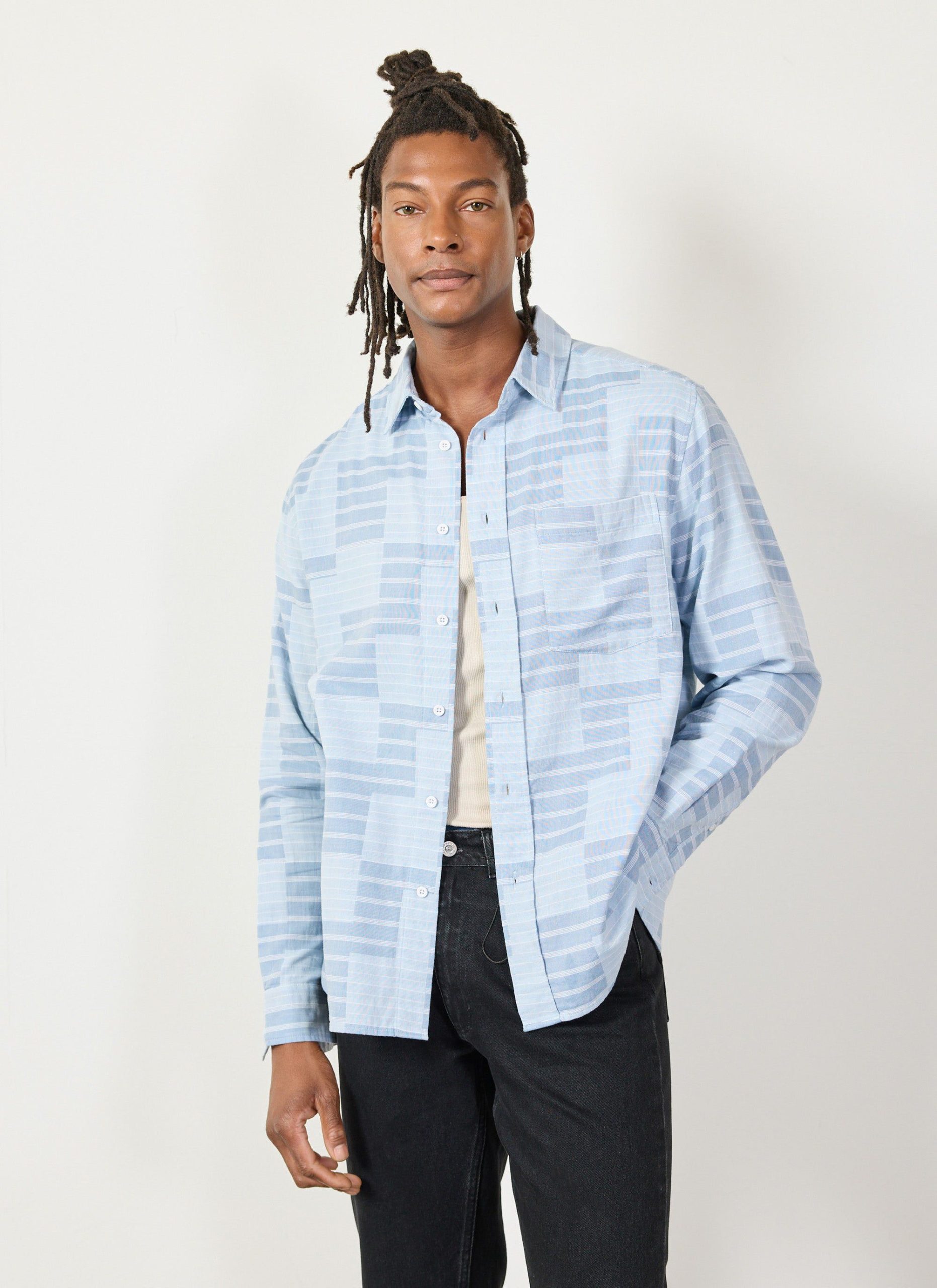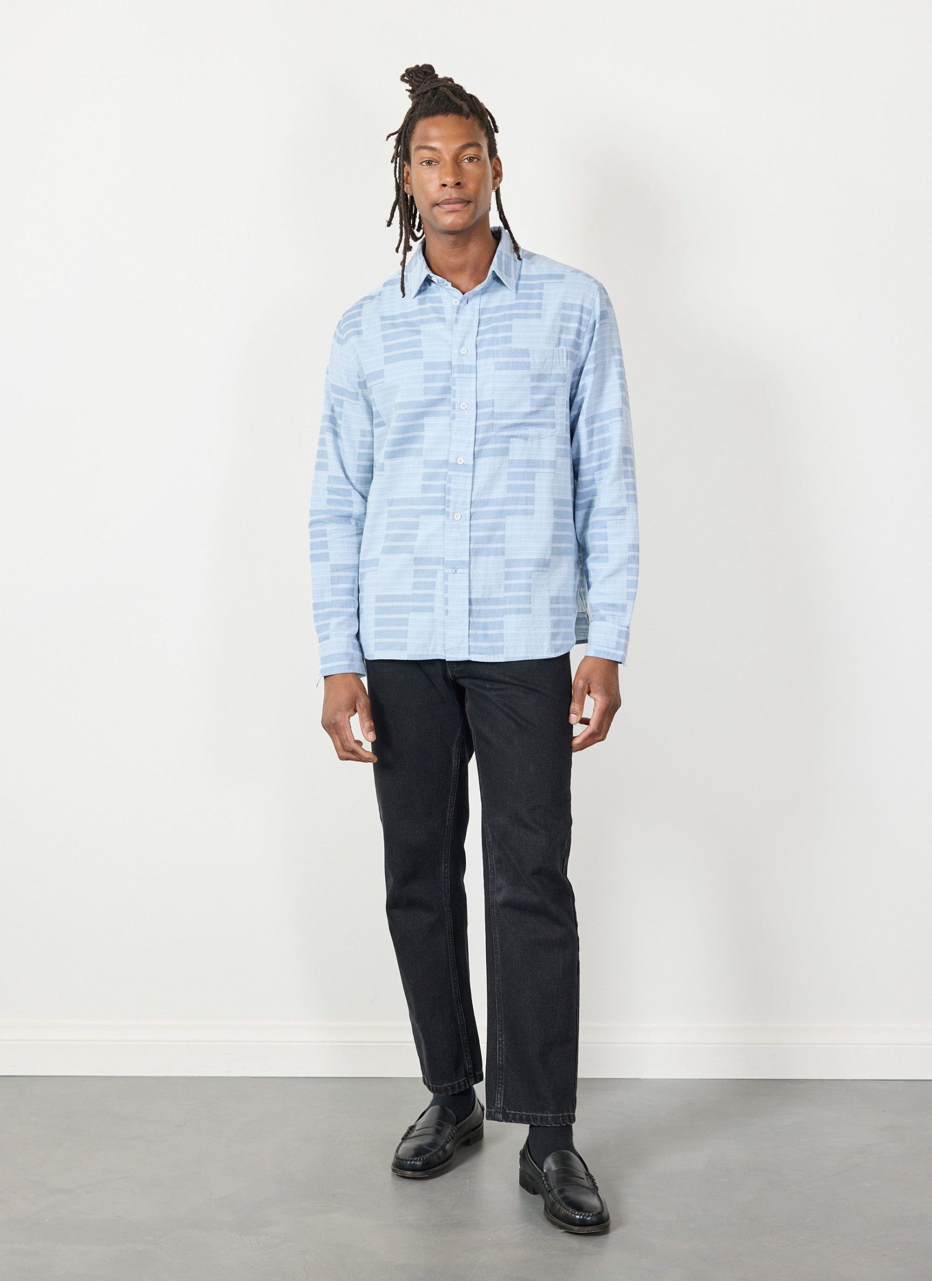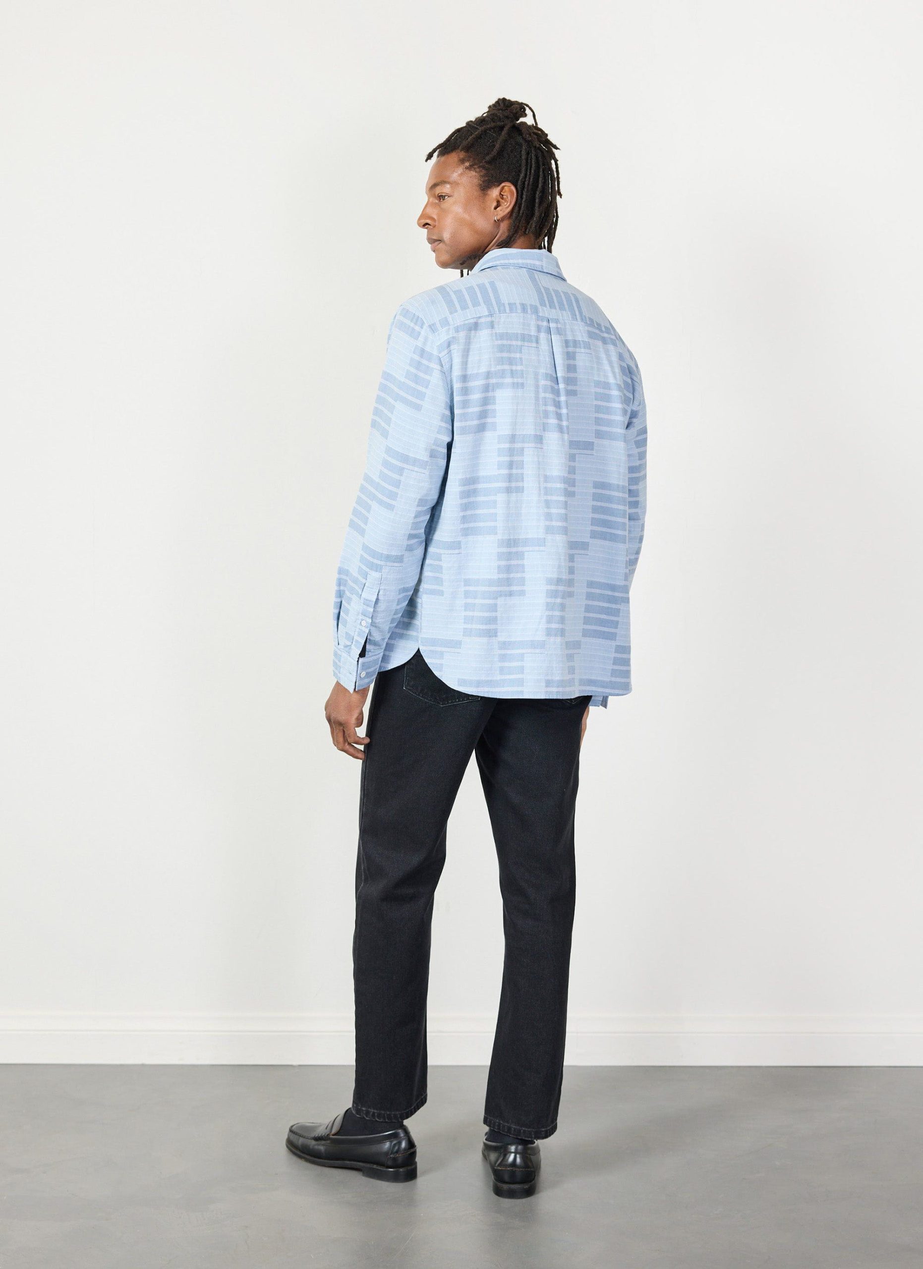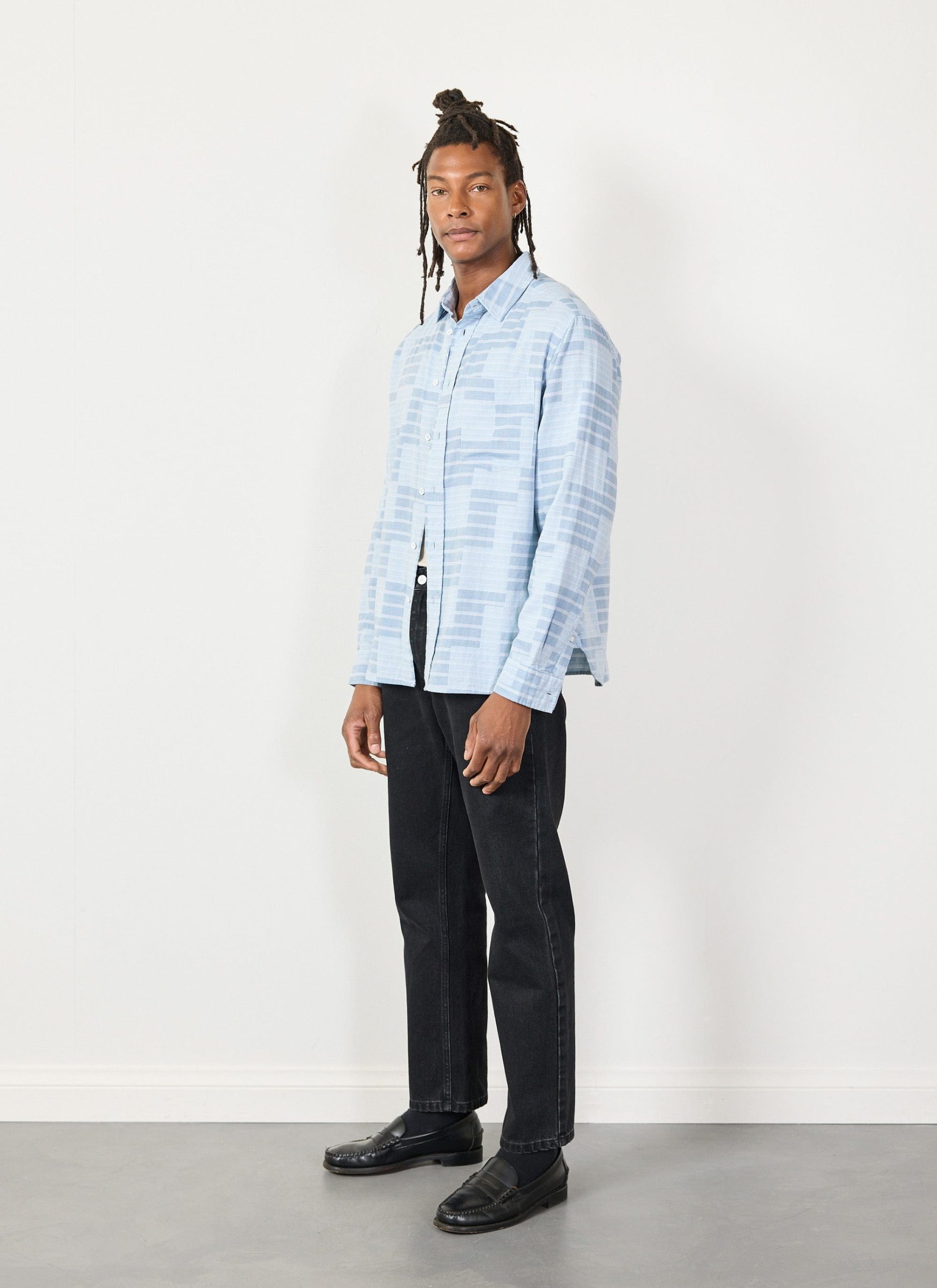 Block patch Pearce shirt, tongue twister, yes, good shirt, also yes. Custom Percival fabric, cut in the blue of the season, check out the macro shots, sweet. Our Pearce shirt fit is a slightly oversized yet comfortable fit, pair with loafer, Percival denim or smart trouser, it’s all up for grabs, well it kind of isn’t as they are made in limited quantities.