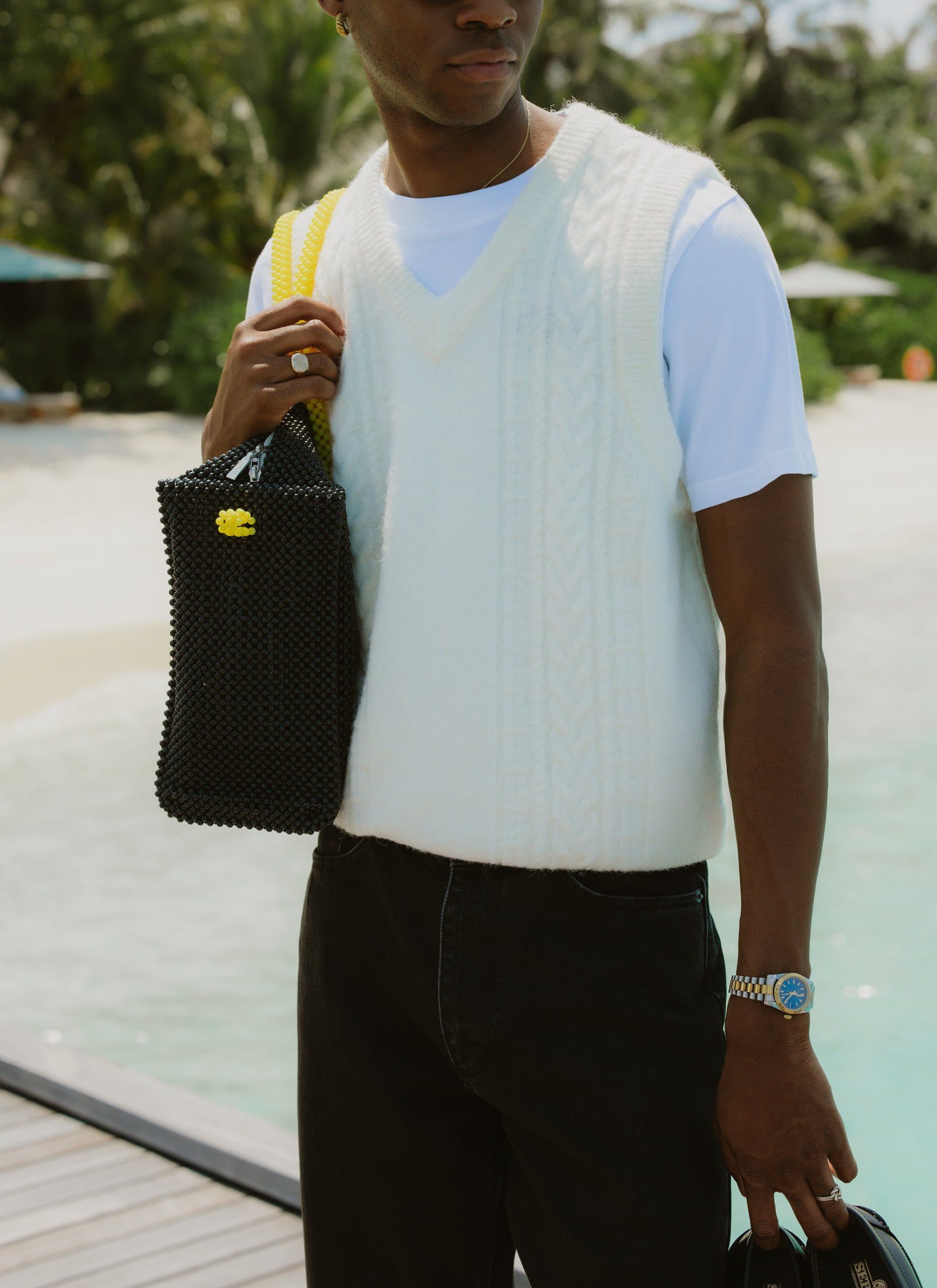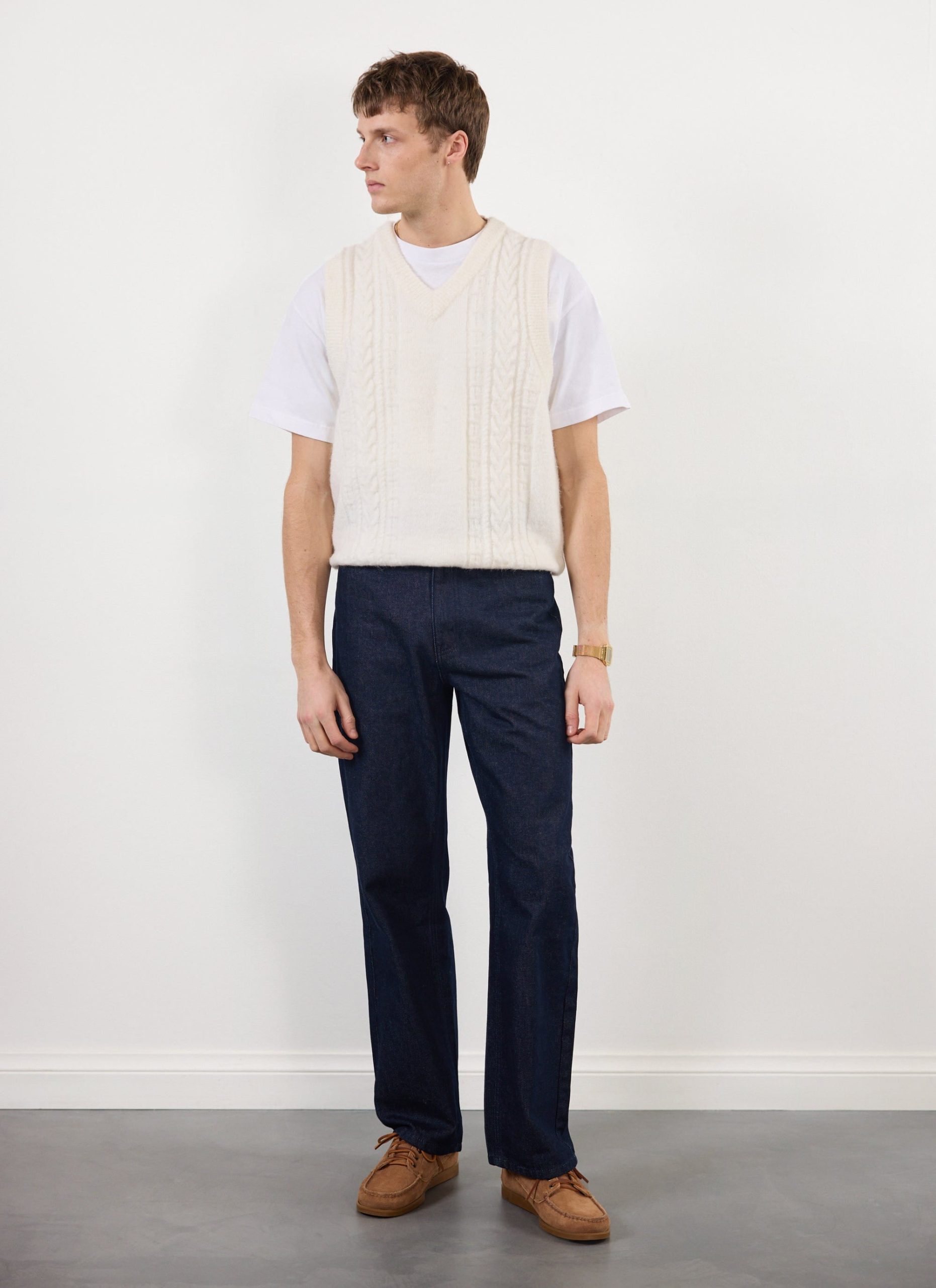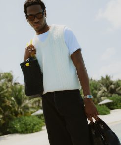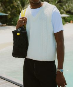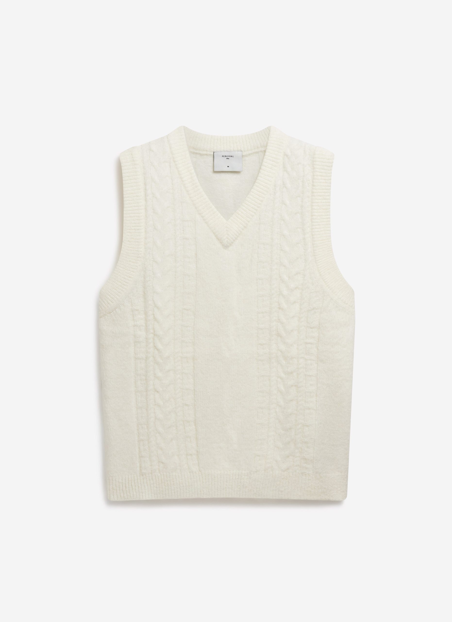 Percival Spring Summer 2025, inspired by Italy, it’s fine people and food, full flavour, full Perci pomodoro, the sauce of good fits. Cable stripe knitted vest, alpaca wool blend, the blend helps it hold its shape and knit texture, it also adds flavour, texture, palatable delight. Perfect for layering, or keeping your warm on spring summer evenings.