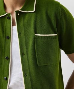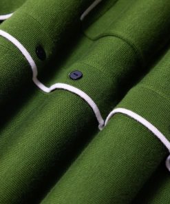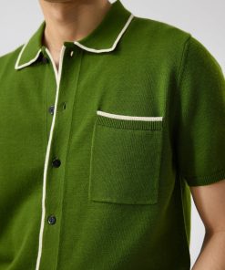 - Features: Crafted in a rich forest green, this men’s knitted shirt blends timeless style with summer-ready comfort. Made from a lightweight, breathable wool blend, it keeps you cool and polished in warm weather. Designed with short ribbed sleeves, a classic button-down front featuring custom Percival buttons, and a practical chest pocket, it’s a versatile staple for any wardrobe. Whether you’re dressing up or down, this green knit shirt adapts effortlessly to your day.