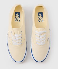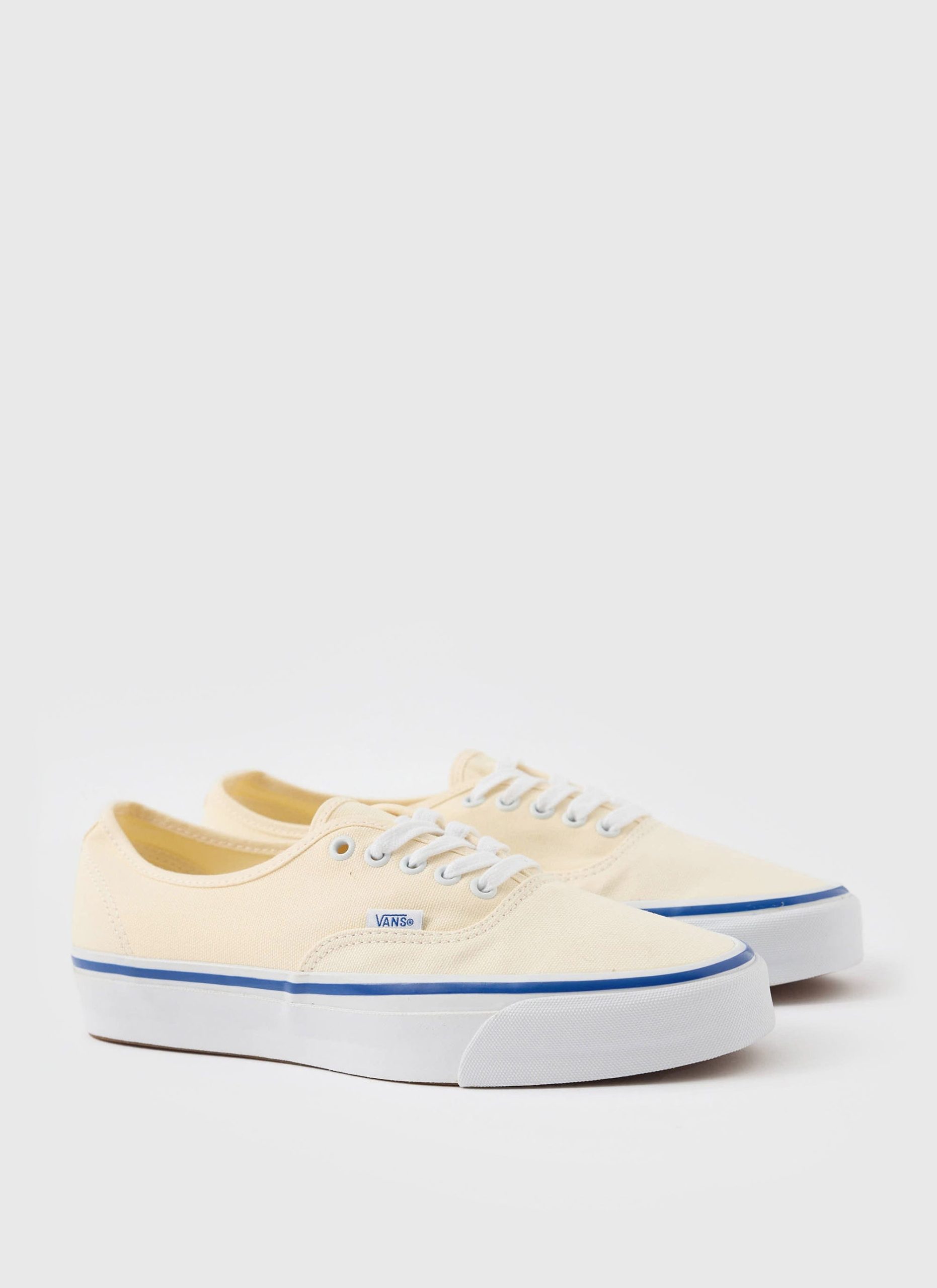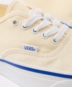 - Features: Vans Authentic 44 Premium Skate Shoes in Off White. A modern take on Vans’ iconic heritage low-top. Built with 226 gm canvas and detailed with a full-grain leather collar lining, these off white trainers offer a balanced blend of durability, comfort, and elevated style. Featuring a woven Vans flag label and gloss-finished higher sidewalls, foxing tape with original ’90s Osnaburg reinforcement for vintage-inspired structure and Sola Foam All-Day Comfort (ADC) insole – a 30% bio-based, anti-fatigue material for everyday cushioning.