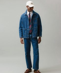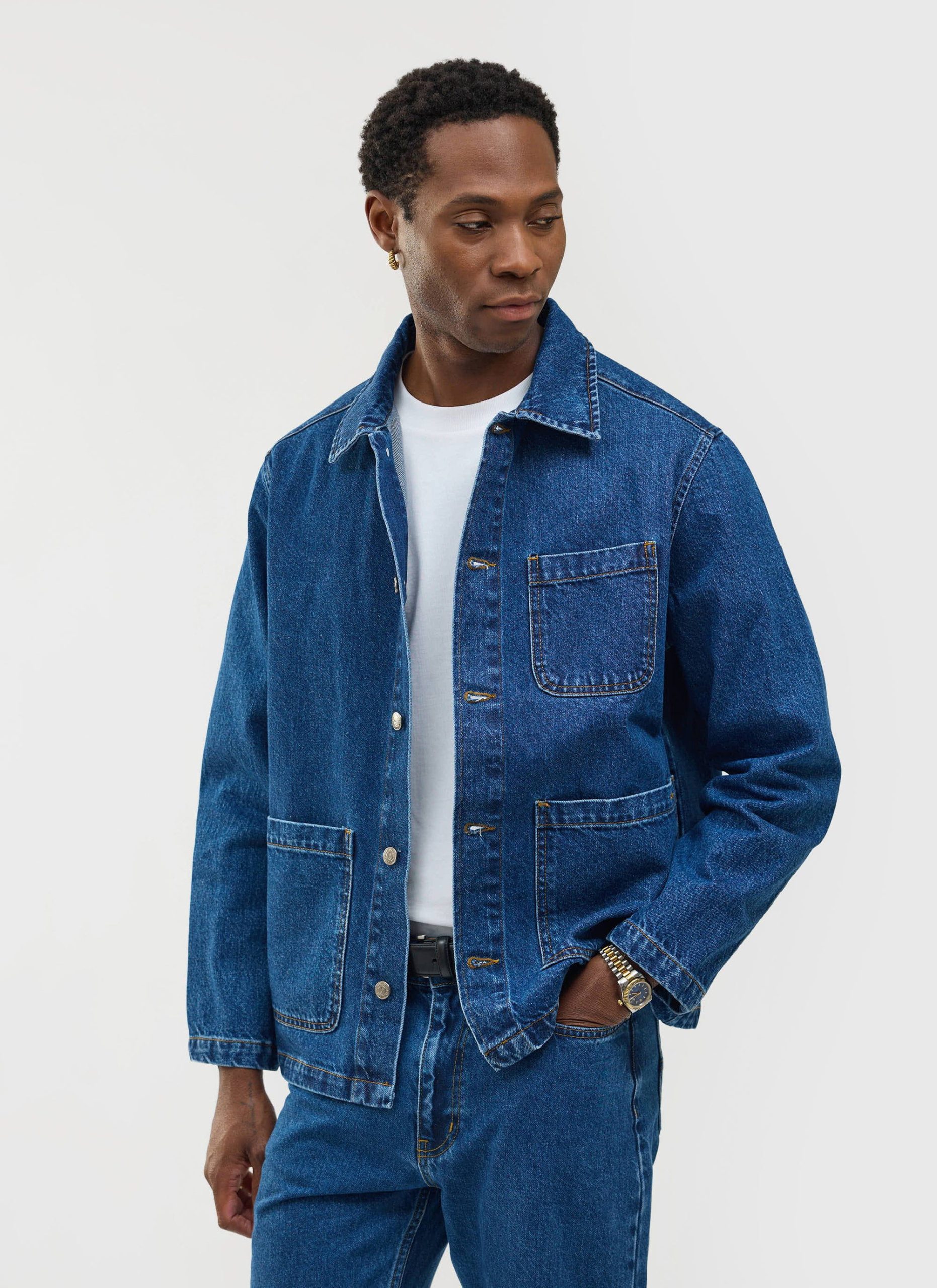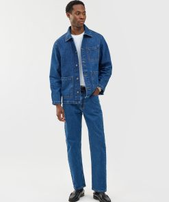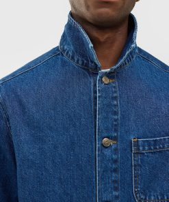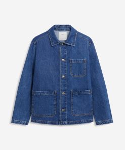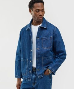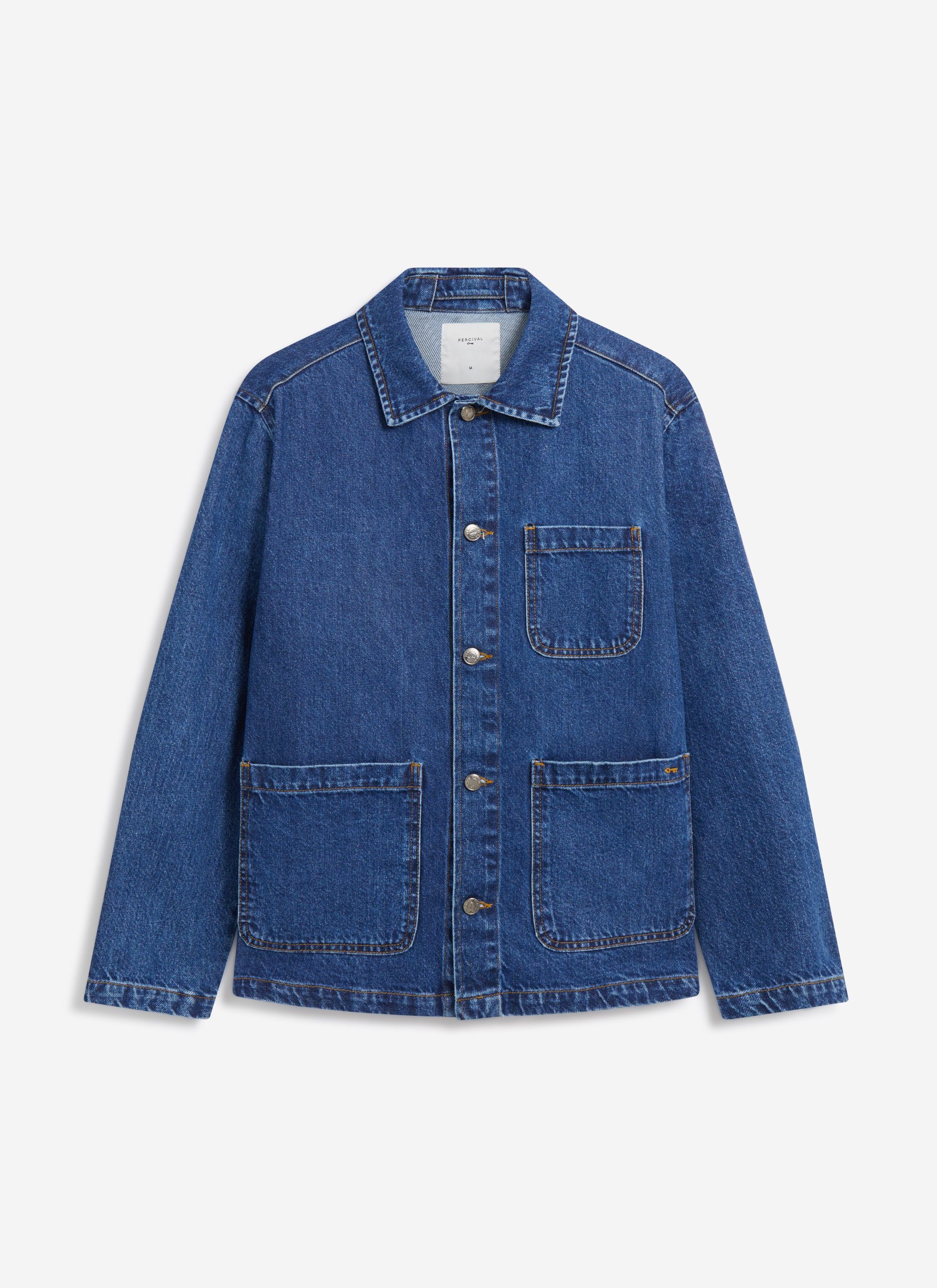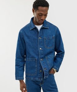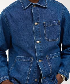 - Features: Men’s mid wash chore jacket blends utilitarian design with refined denim craftsmanship, offering a french workers jacket inspired look. Made from premium cotton denim and cut to a true-to-size fit, it features reinforced stitching, and clean lines throughout. Functional details include three front patch pockets, internal storage pockets, a full denim shank button closure, and tonal topstitching. Finished with a classic collar and subtle perci branding, the mid wash and workwear heritage make it a timeless layering staple, perfect over tees or styled with matching denim for a coordinated look.