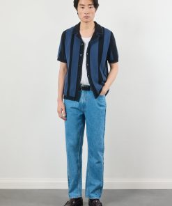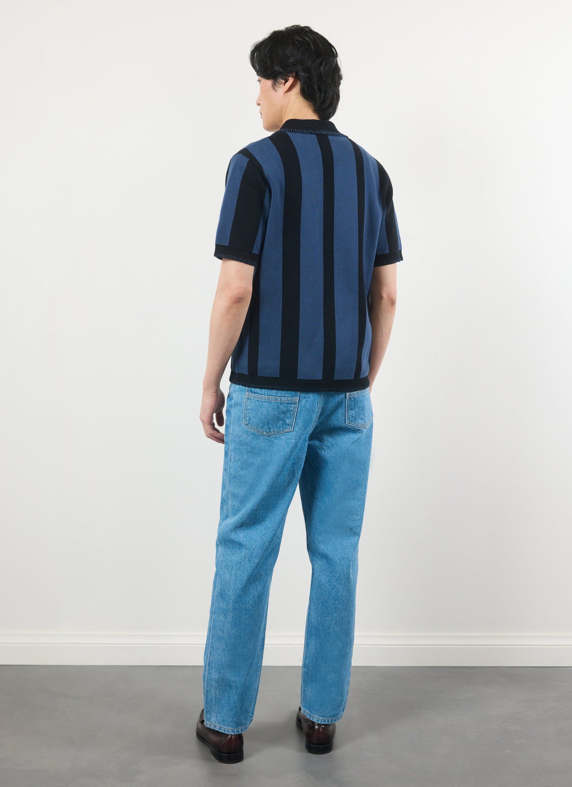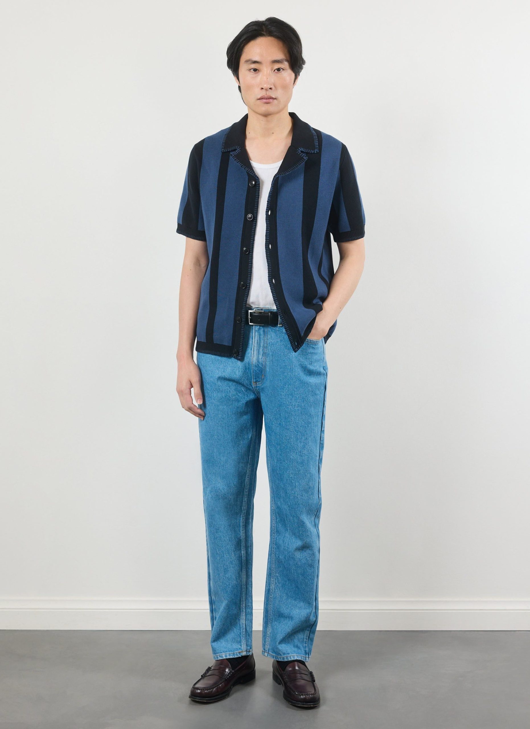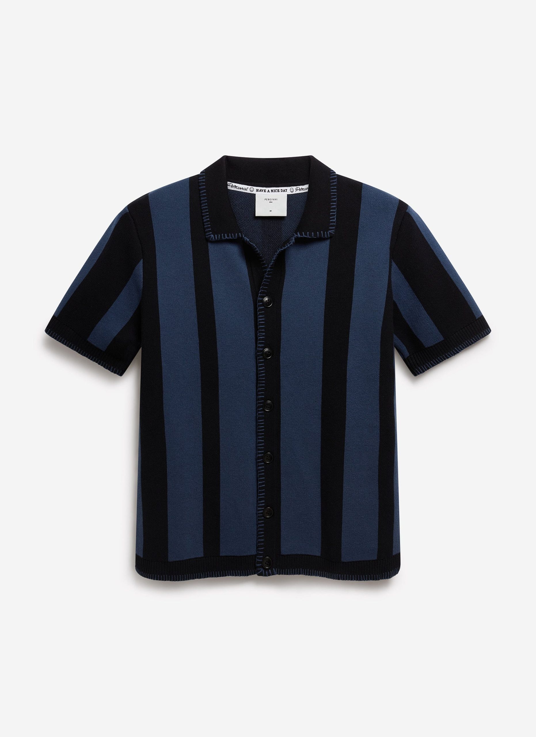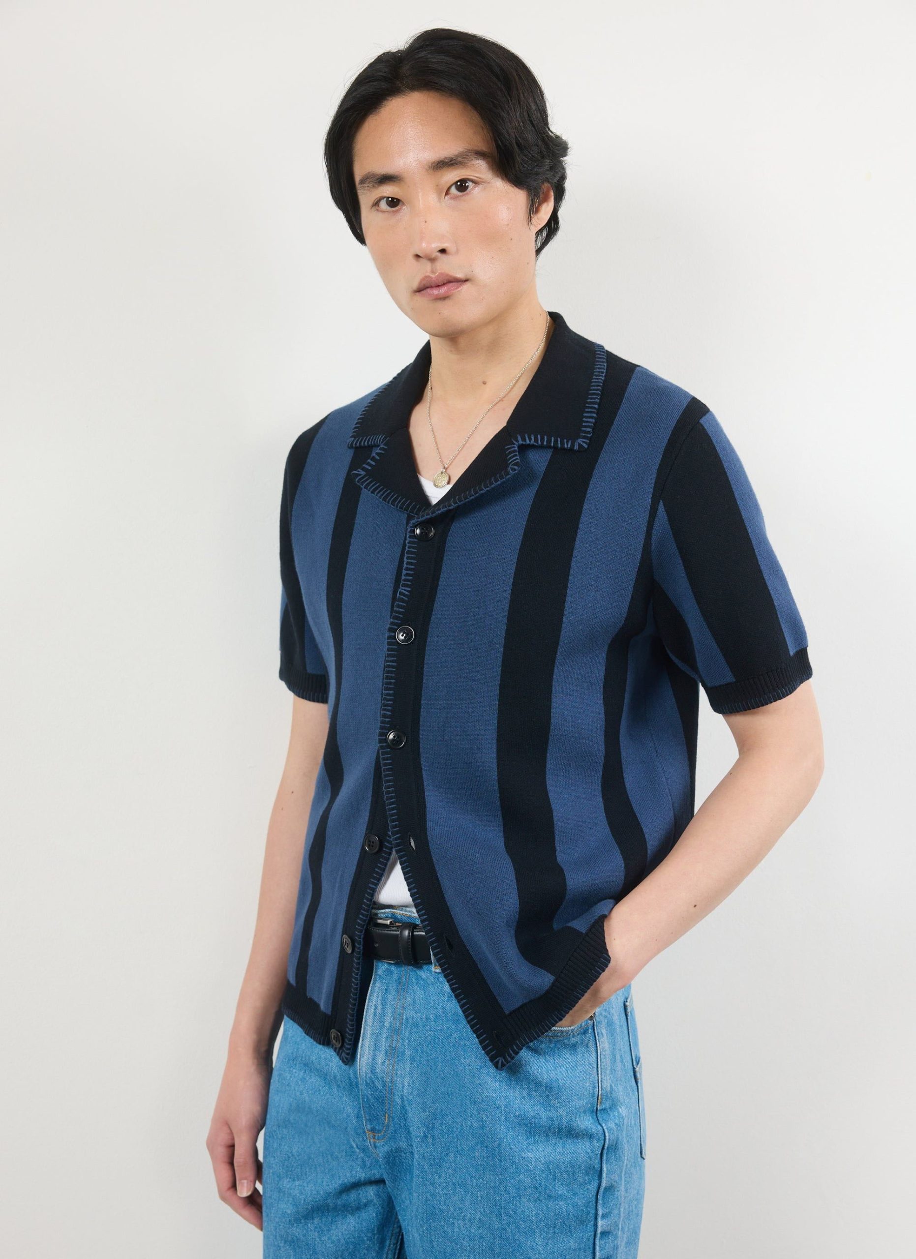 Part of the Percival Spring Summer 2025 collection, striped knit cuban collared shirt. Quality cotton knit, vintage but classic, a never out of style style, however a new Percival knit shirt collar style for 2025. Tonal knit stripe with blanket stitch detail at collar edge and placket. Summer 2025 Percival, full flavour, full Perci pomodoro, perelló, kalamata, amatriciana all fresh, all in limited quantities.