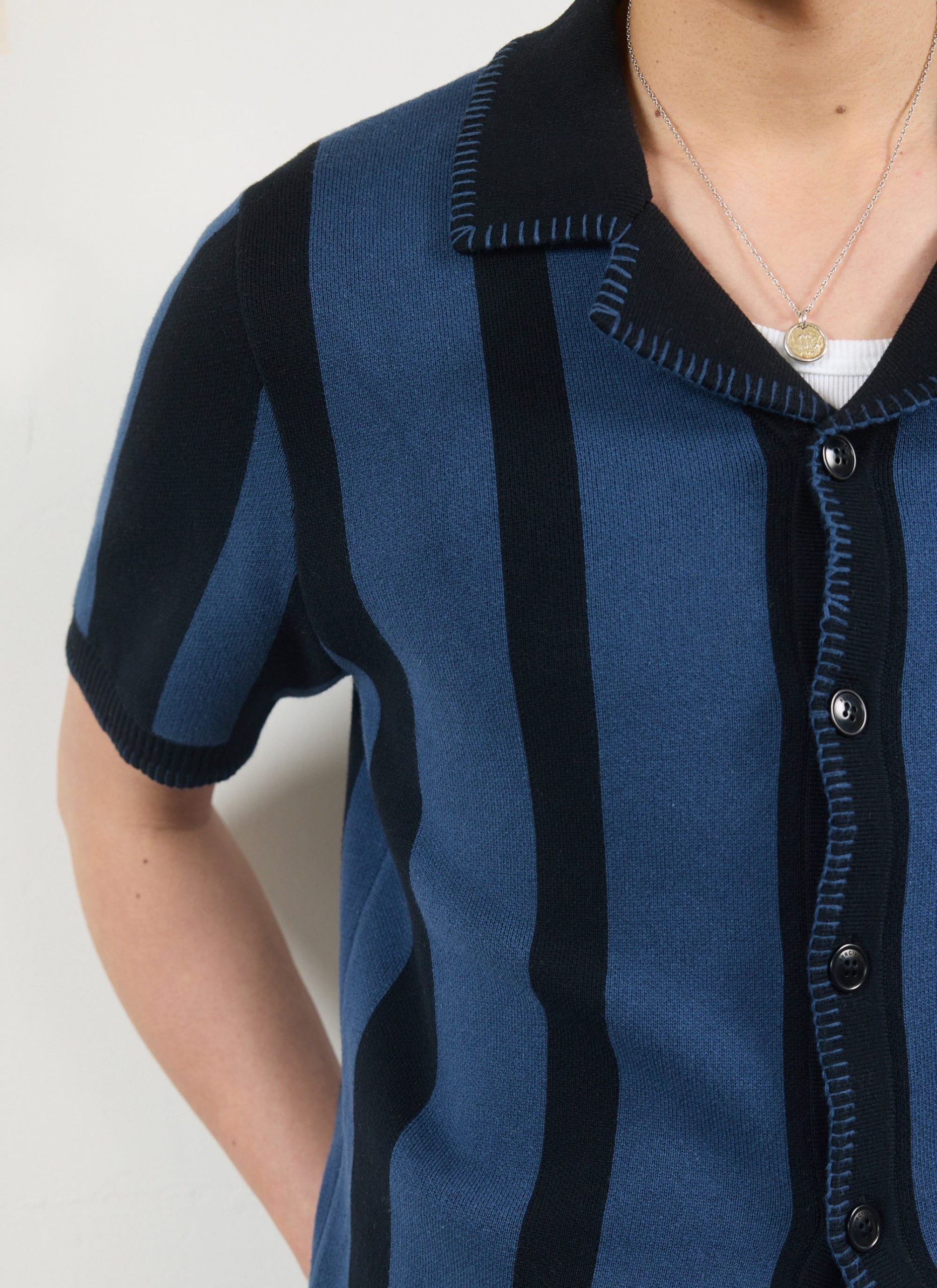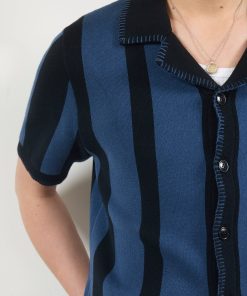 - Features: Men’s Cuban Shirt in Striped Navy Blue. Made from 100% cotton for durability and comfort, this Striped Shirt offers a standard fit as well as a blanket stitch collar and placket for a retro inspired look. A modern take on a buttoned shirt which is perfect for wearing in warmer months and for layering.