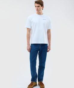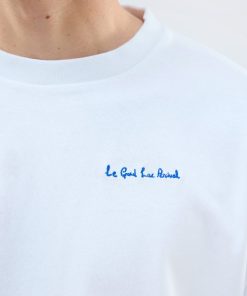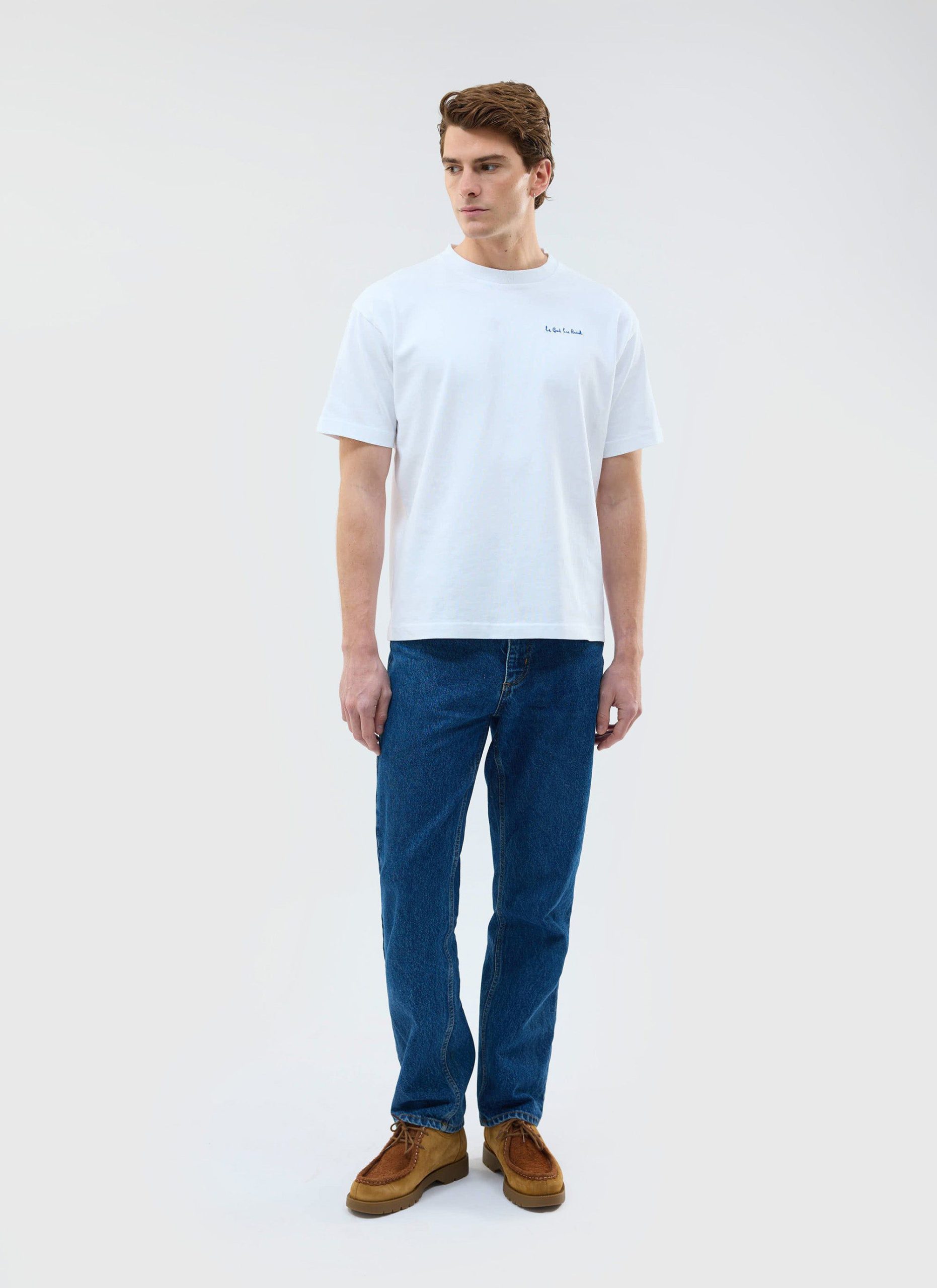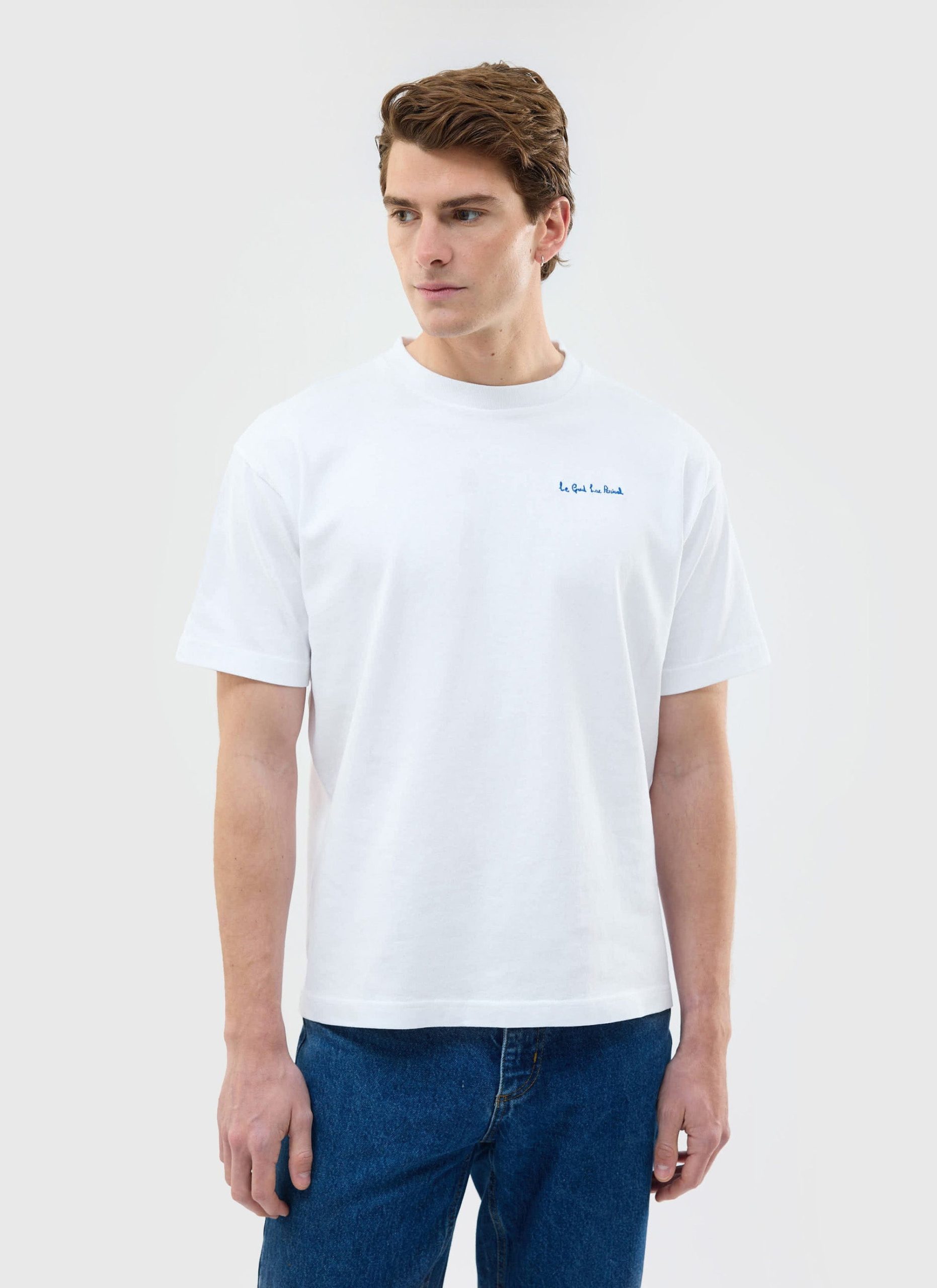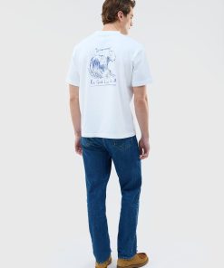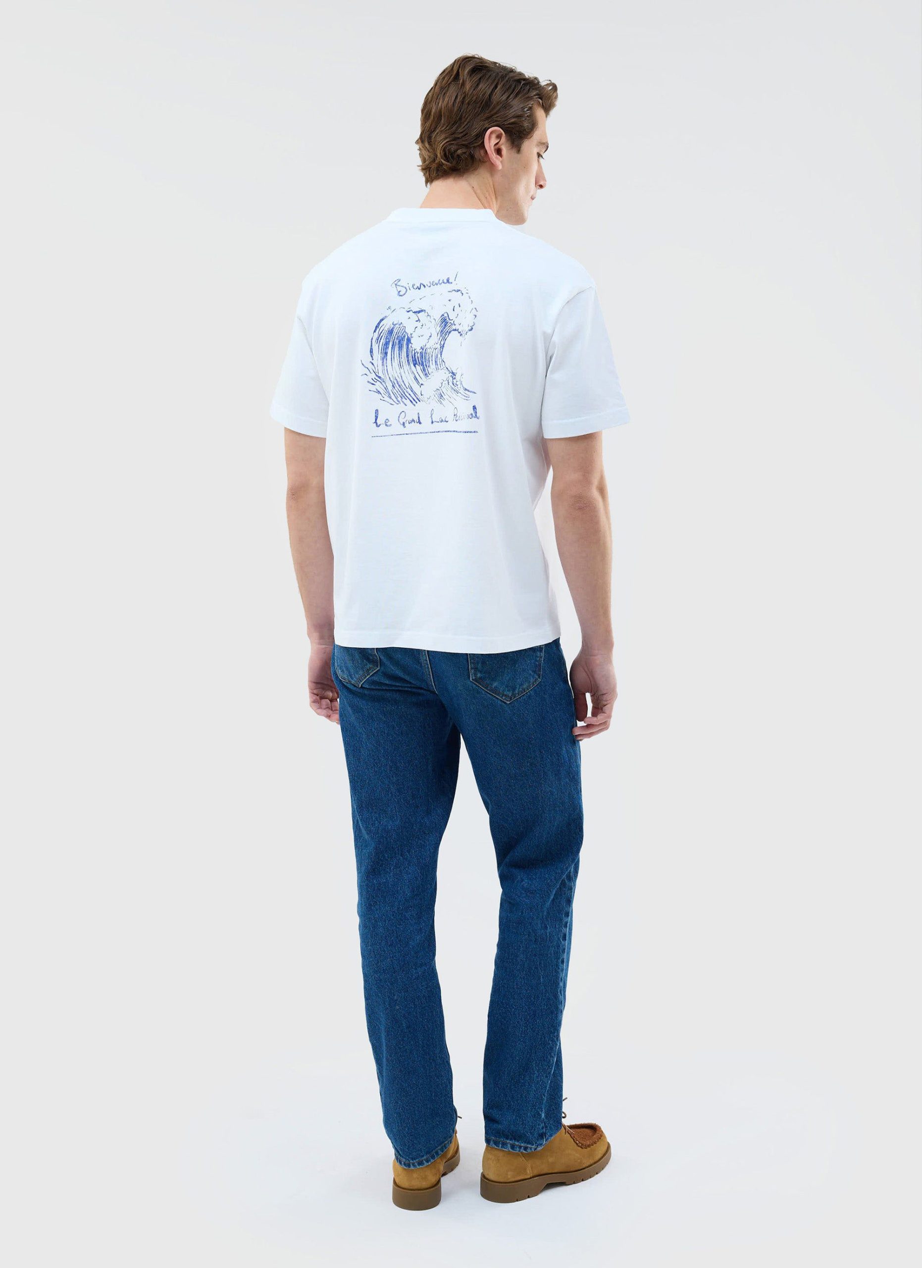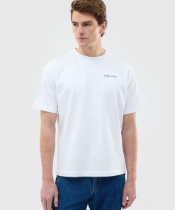 - Features: Men’s white t shirt with a heavyweight, oversized fit. Made from organic cotton for comfort and durability. Designed with a ribbed neck, embroidered text on the chest, and a ‘wave’ graphic on the back, this men’s short sleeve graphic tee is perfect for everyday wear and stands as a staple for every occasion.