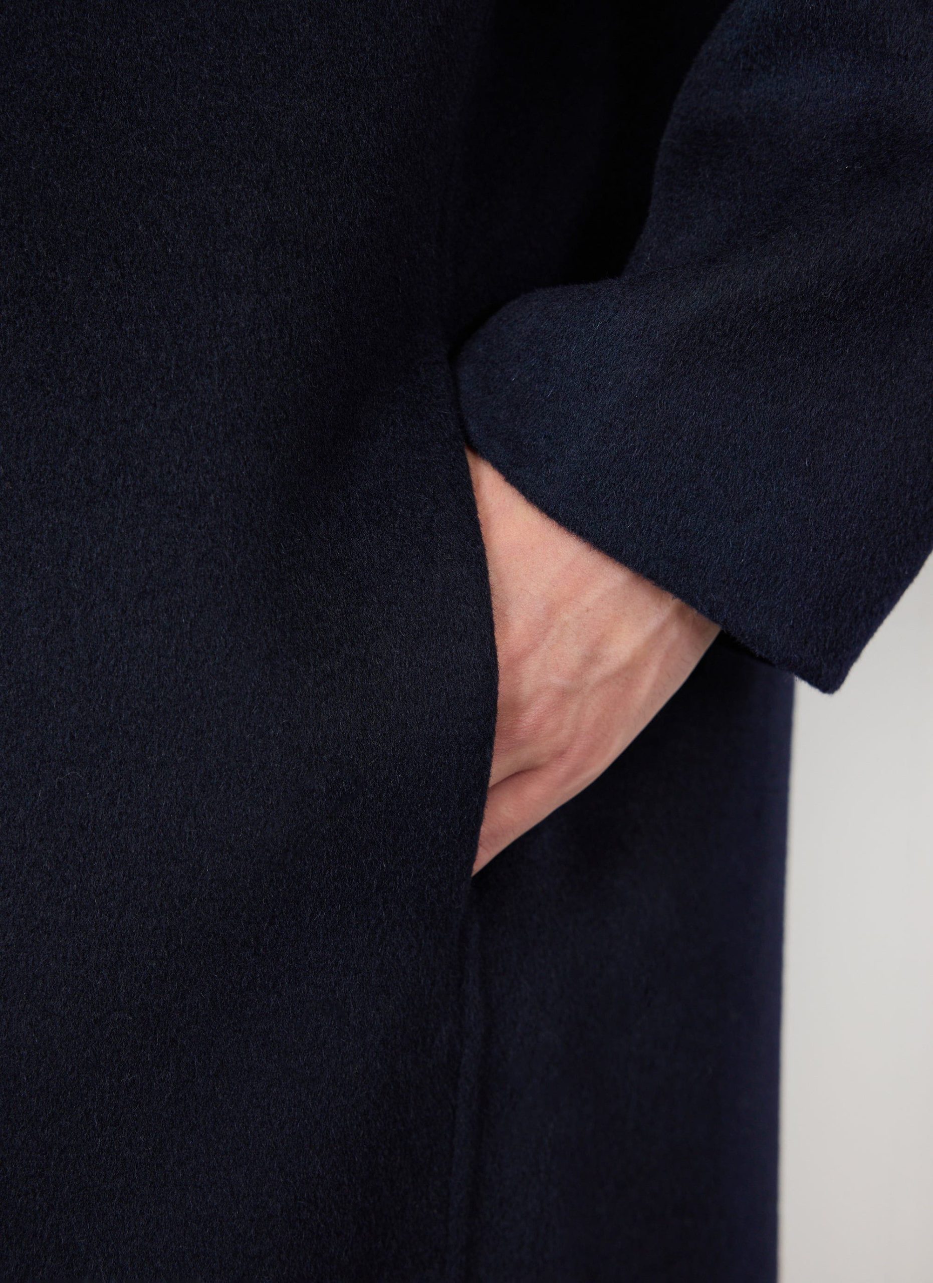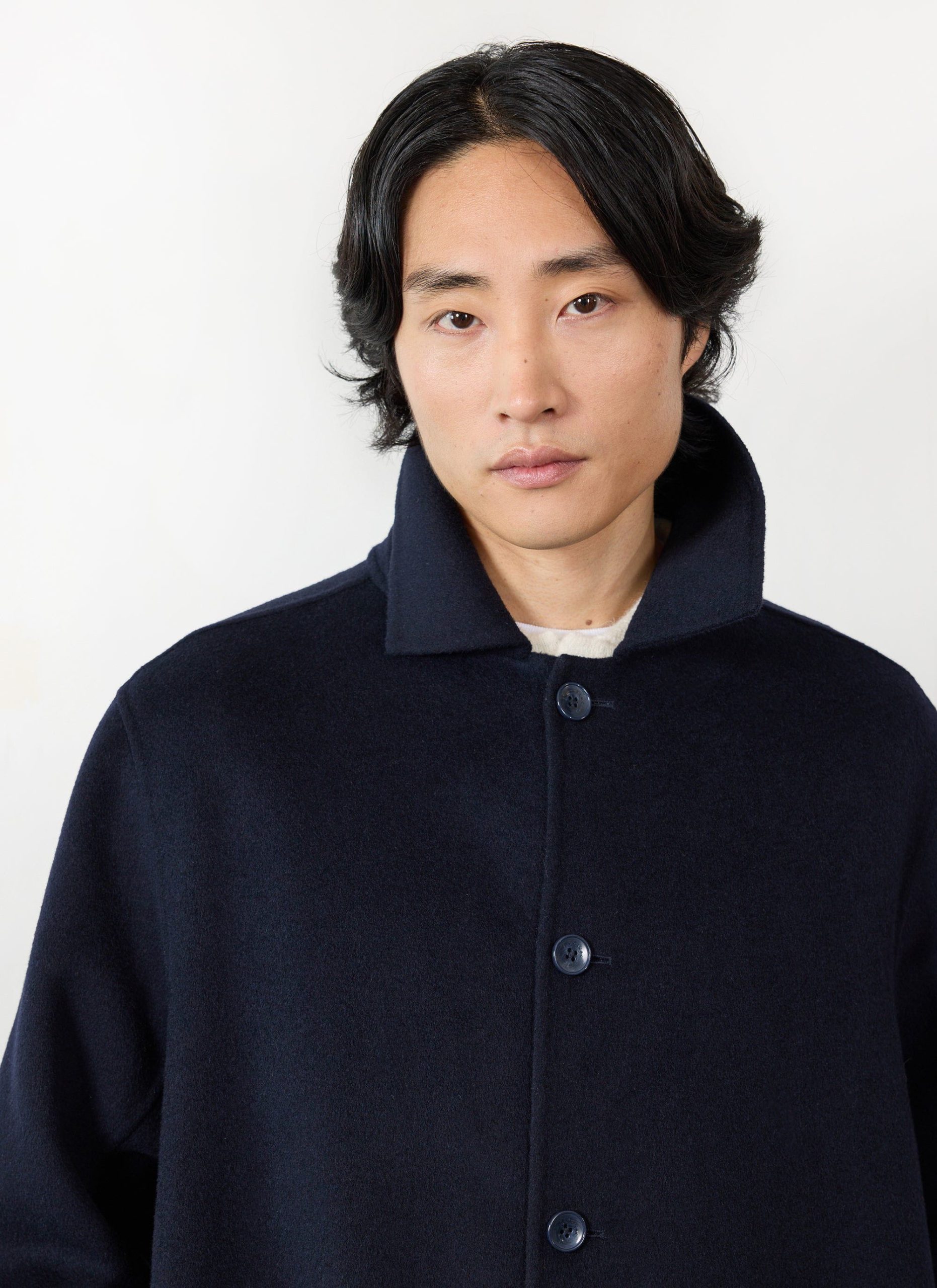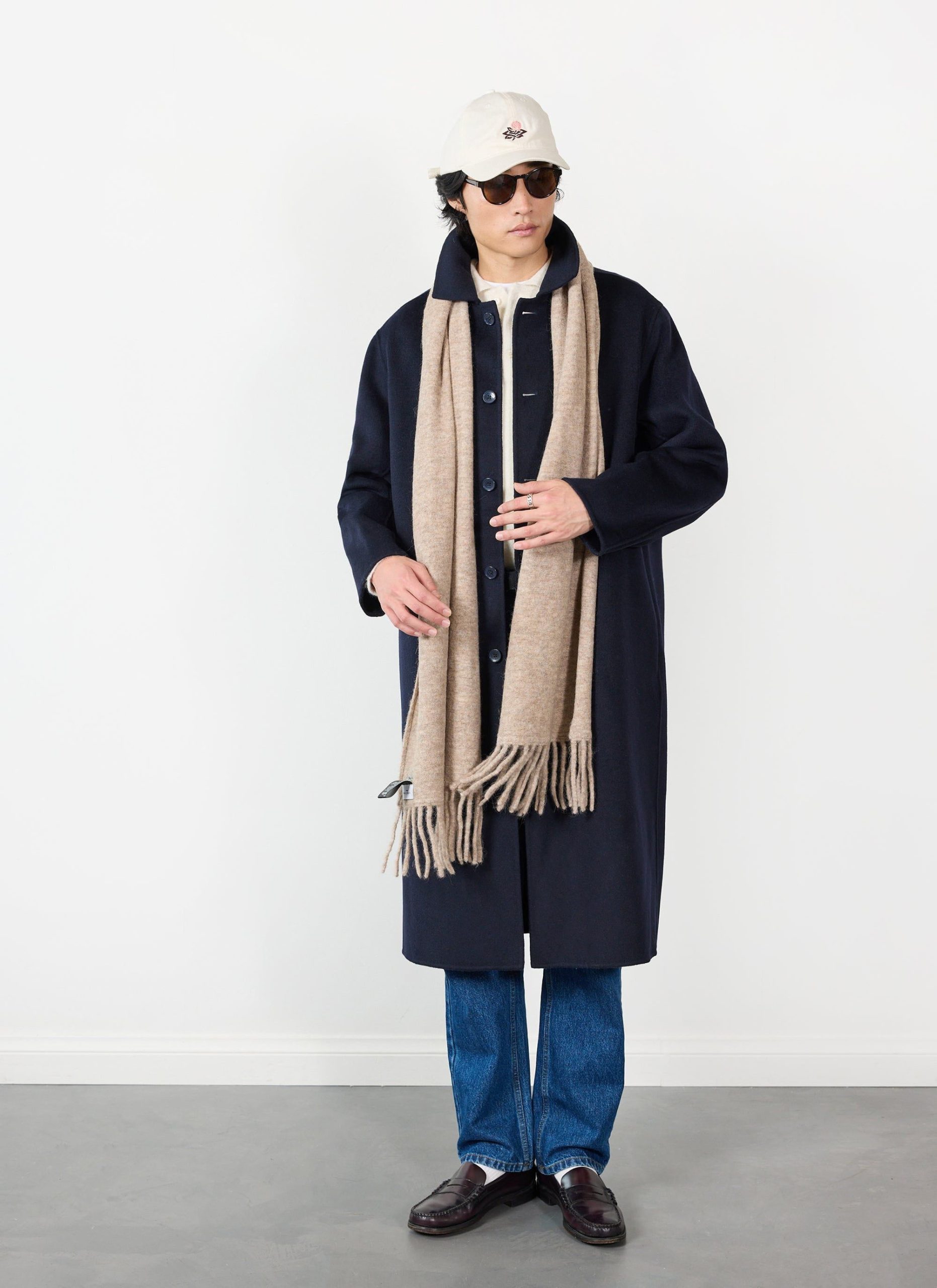 Winter can suck, dark days, cold, but let us celebrate that. Look at this layering, more layers than uncle Onion Orion, and it is much better looking. Cut in a 100% wool, classic navy trench coat, come-car-coat, goes with everything, nice length, beautiful flow, fair price per wear. Throw it over a smart suit, or smother it over winter sweat suit. It is your coat, the coat of the winter.