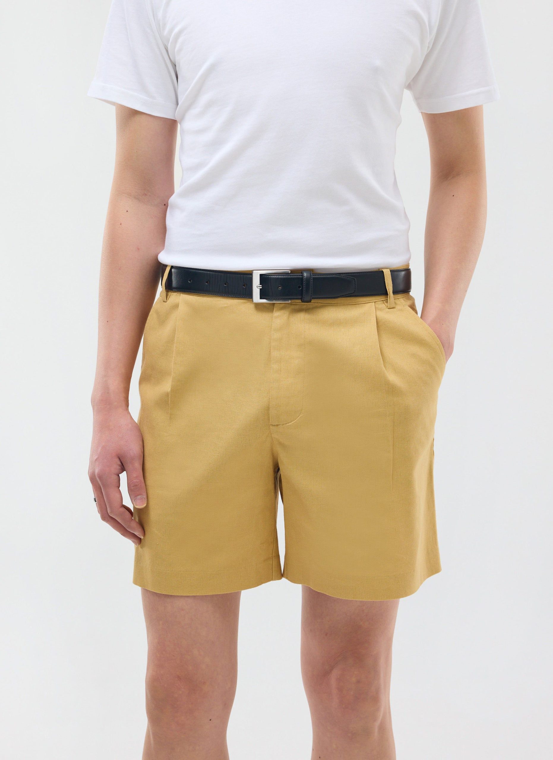 - Features: Men’s pleated shorts made from 100% linen. In a tailored fit with a fixed waistband, front pleat details, a wide width and length that finishes above the knee, and back welt pockets, these green linen shorts are ideal for spring and summer months.