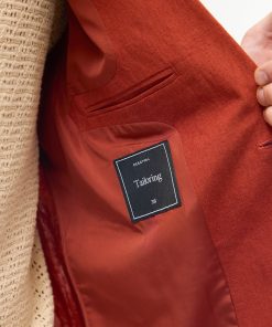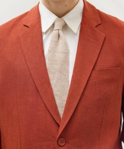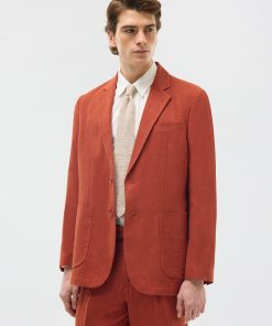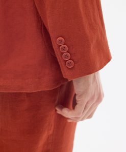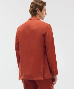 - Features: Men’s Linen Blazer in Red, made from a lightweight 100% Linen fabric in a rust red colourway. Our Red Linen Suit Jacket is made with increased body and sleeve widths for comfort and thin shoulder pads for a structured shape. The Relaxed Blazer in Red is finished with back vents, chest pockets and button-fastening. This lightweight Linen Suit Jacket is ideal for Weddings & Smart Dressing all year round.
