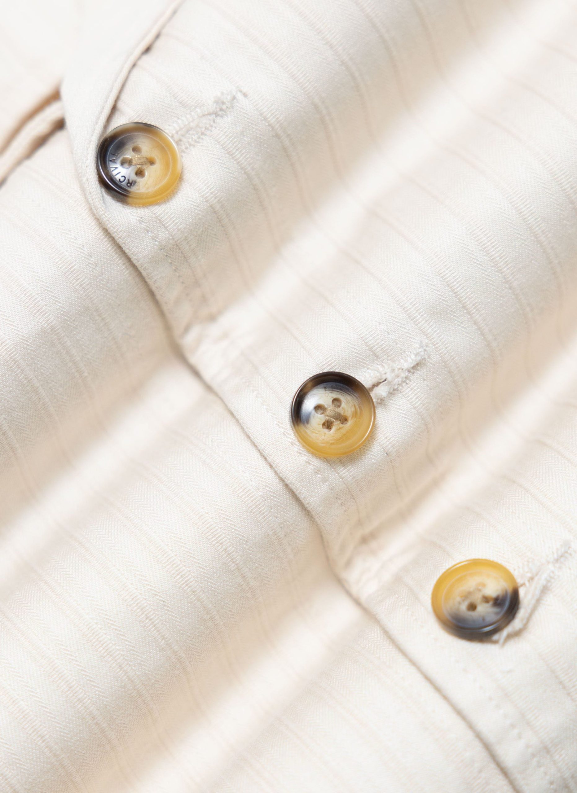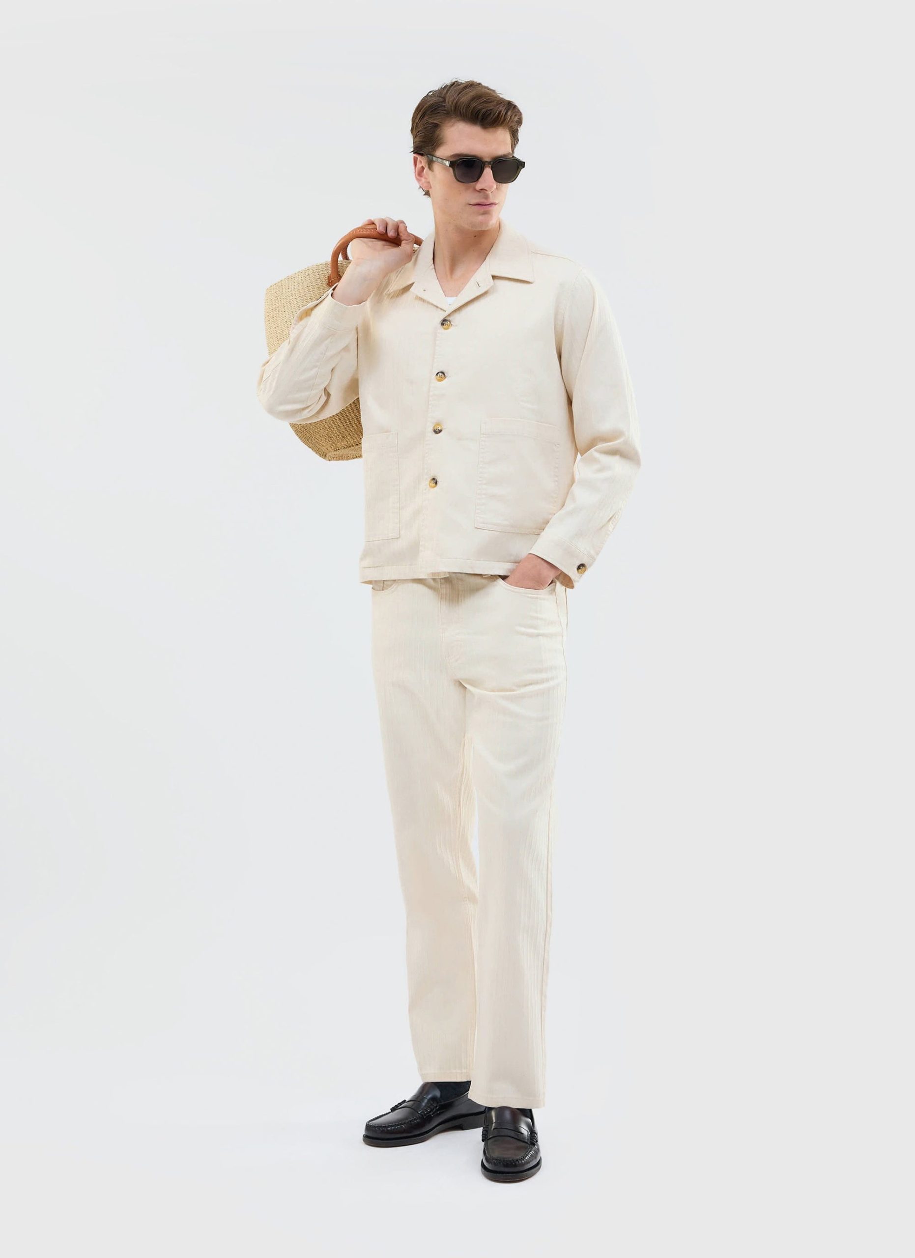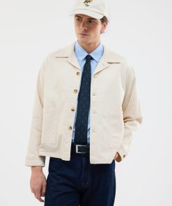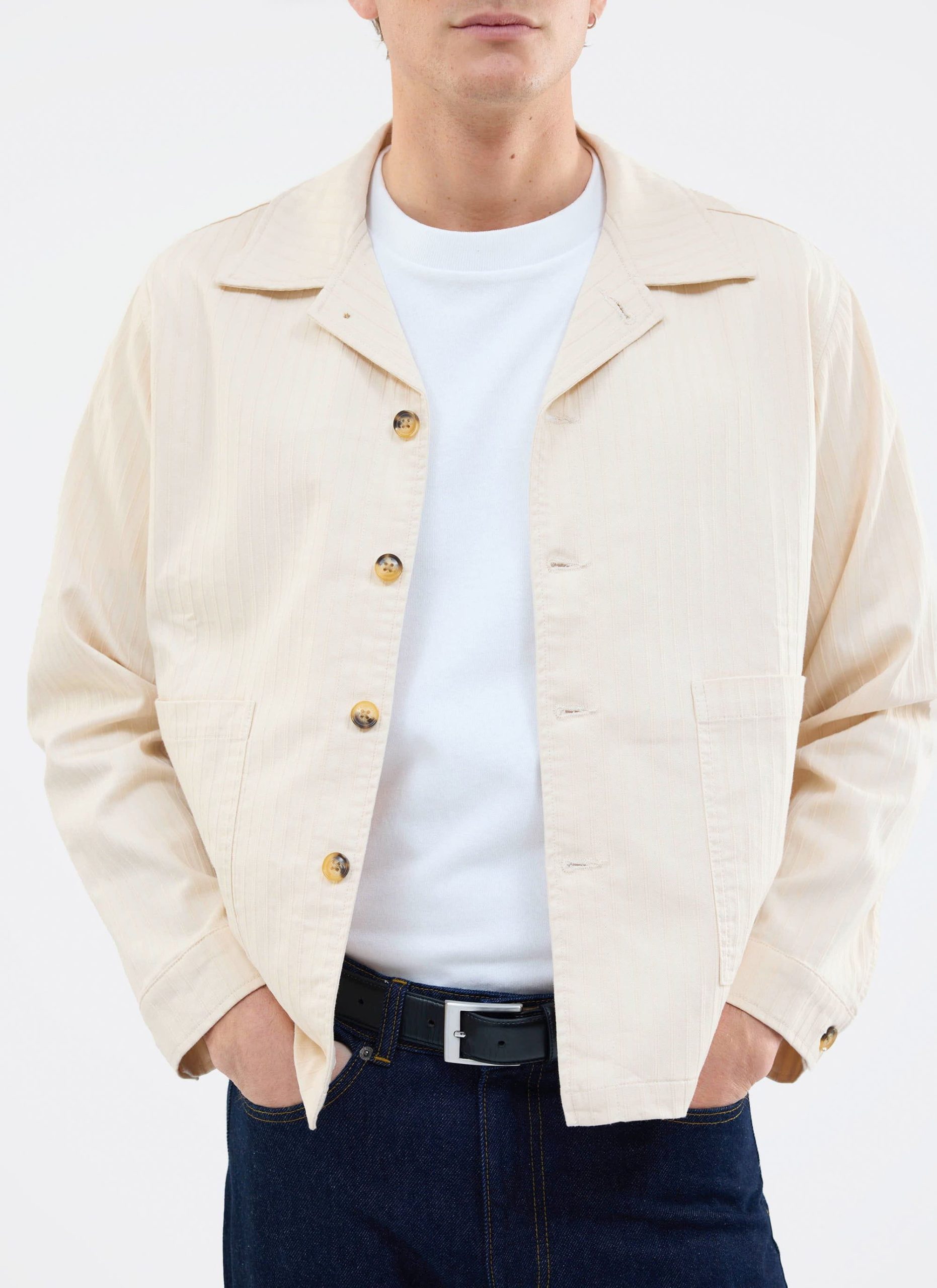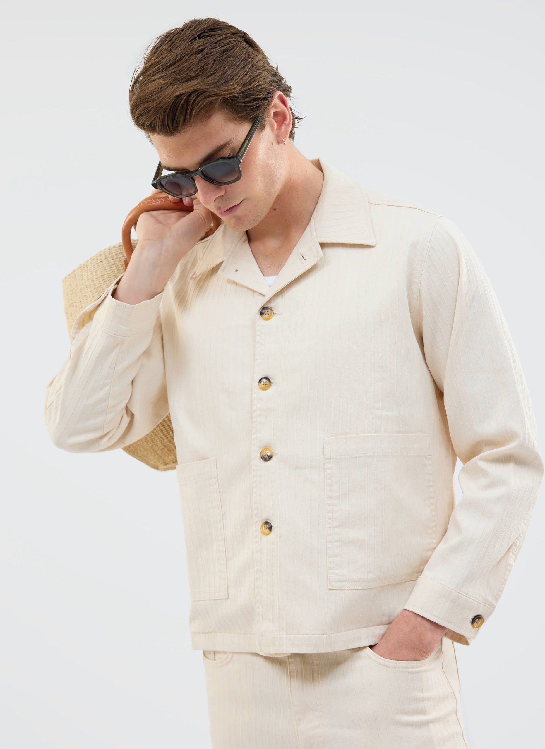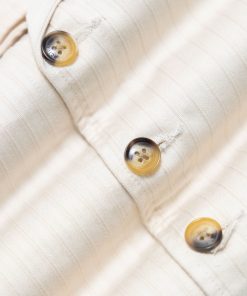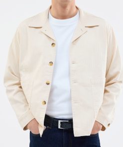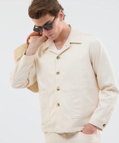 - Features: Men’s cream overshirt jacket featuring custom Percival buttons, a cuban style collar, patch pockets, faint ribbed texture, an internal storage pocket, and button cuffs. Cut at the hip for a slightly cropped but balanced fit, this summer weight overshirt is perfect for everyday wear. Effortlessly pair the utility overshirt with any summer shirt, polo, or tee for a clean, laid-back look.