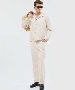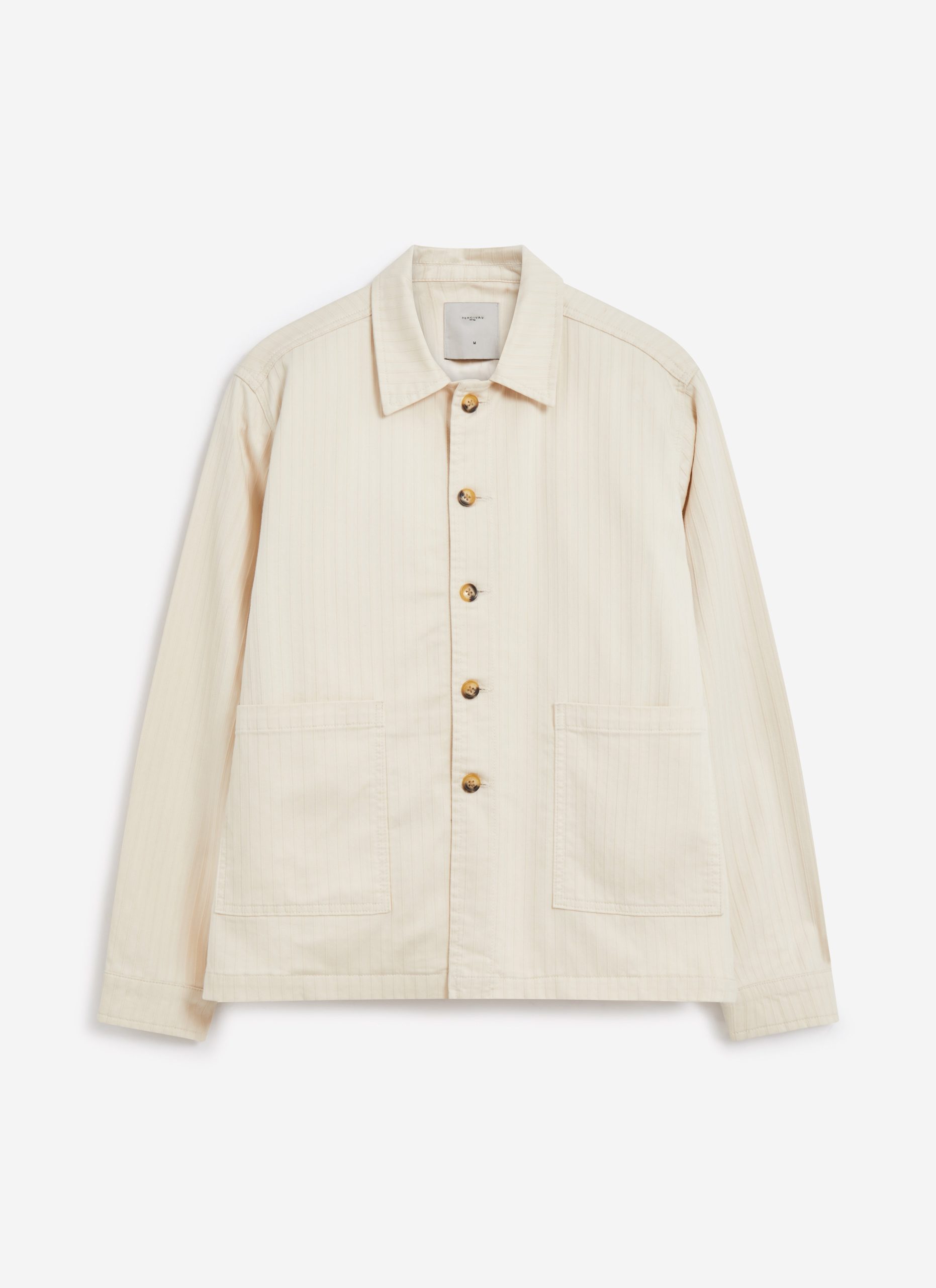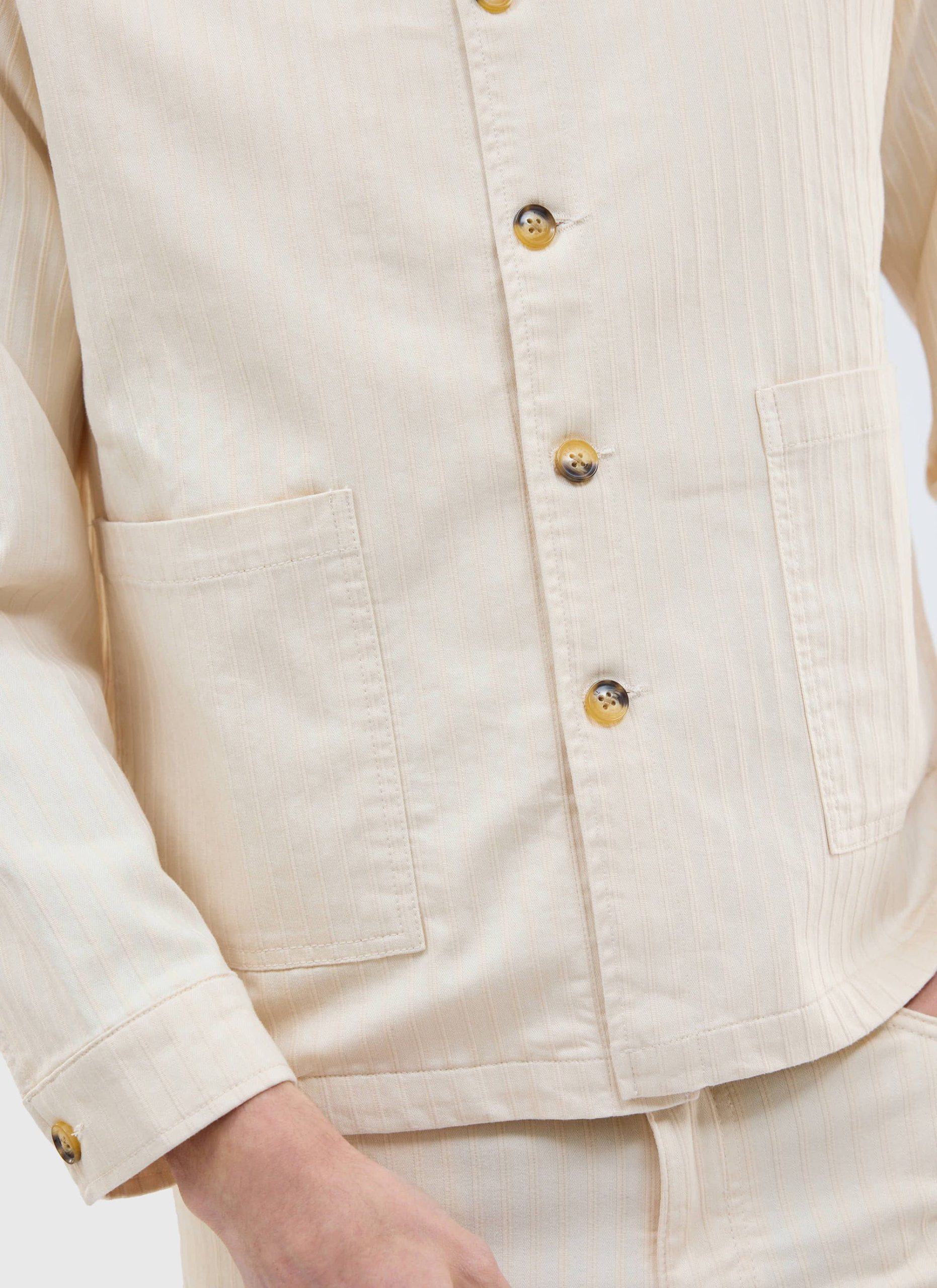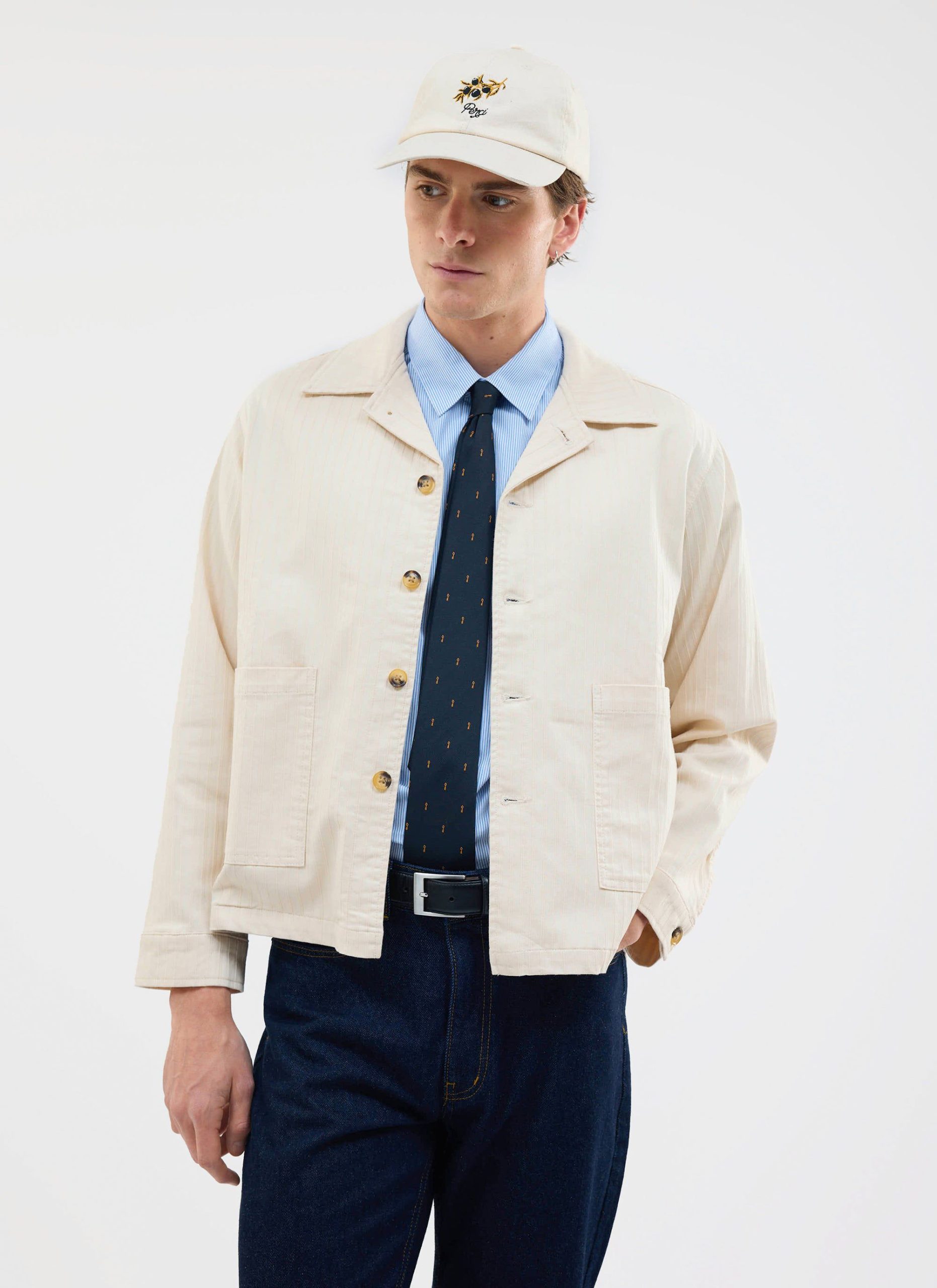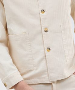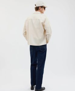 - Features: Men’s cream overshirt jacket featuring custom Percival buttons, a cuban style collar, patch pockets, faint ribbed texture, an internal storage pocket, and button cuffs. Cut at the hip for a slightly cropped but balanced fit, this summer weight overshirt is perfect for everyday wear. Effortlessly pair the utility overshirt with any summer shirt, polo, or tee for a clean, laid-back look.