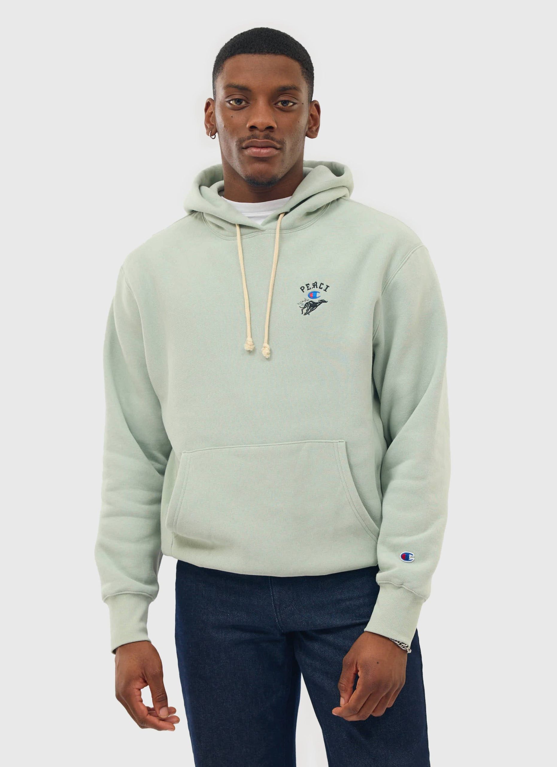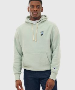 - Features: Men’s Reverse Weave Champion Hoodie in Sage. This Heavyweight Cotton Hoodie is embroidered in London with a hand drawn Percival illustration ‘Tiger Mascot’ and iconic C logo patch on the sleeve. Featuring ribbed cuffs, drawstrings, a hood and kangaroo pocket. The Champion Jumper is a regular fit and is ideal for transitional seasons and everyday wear.