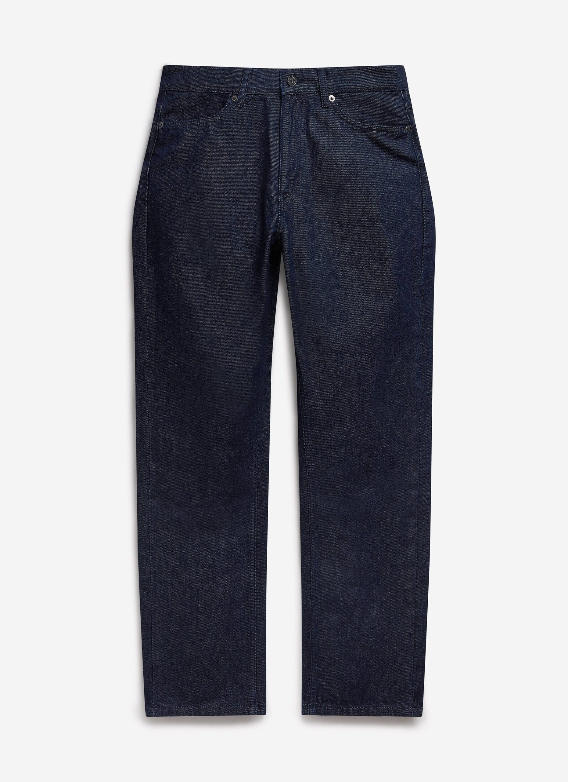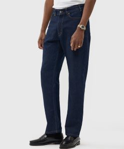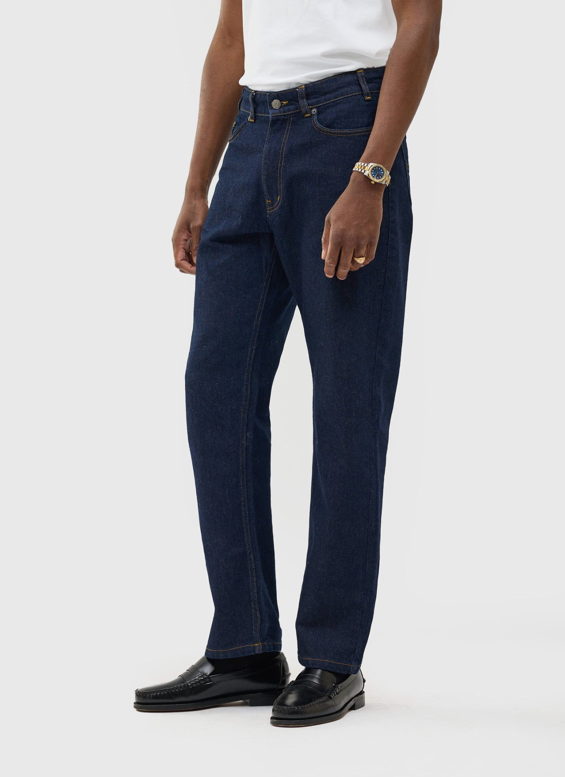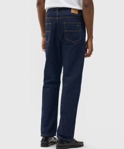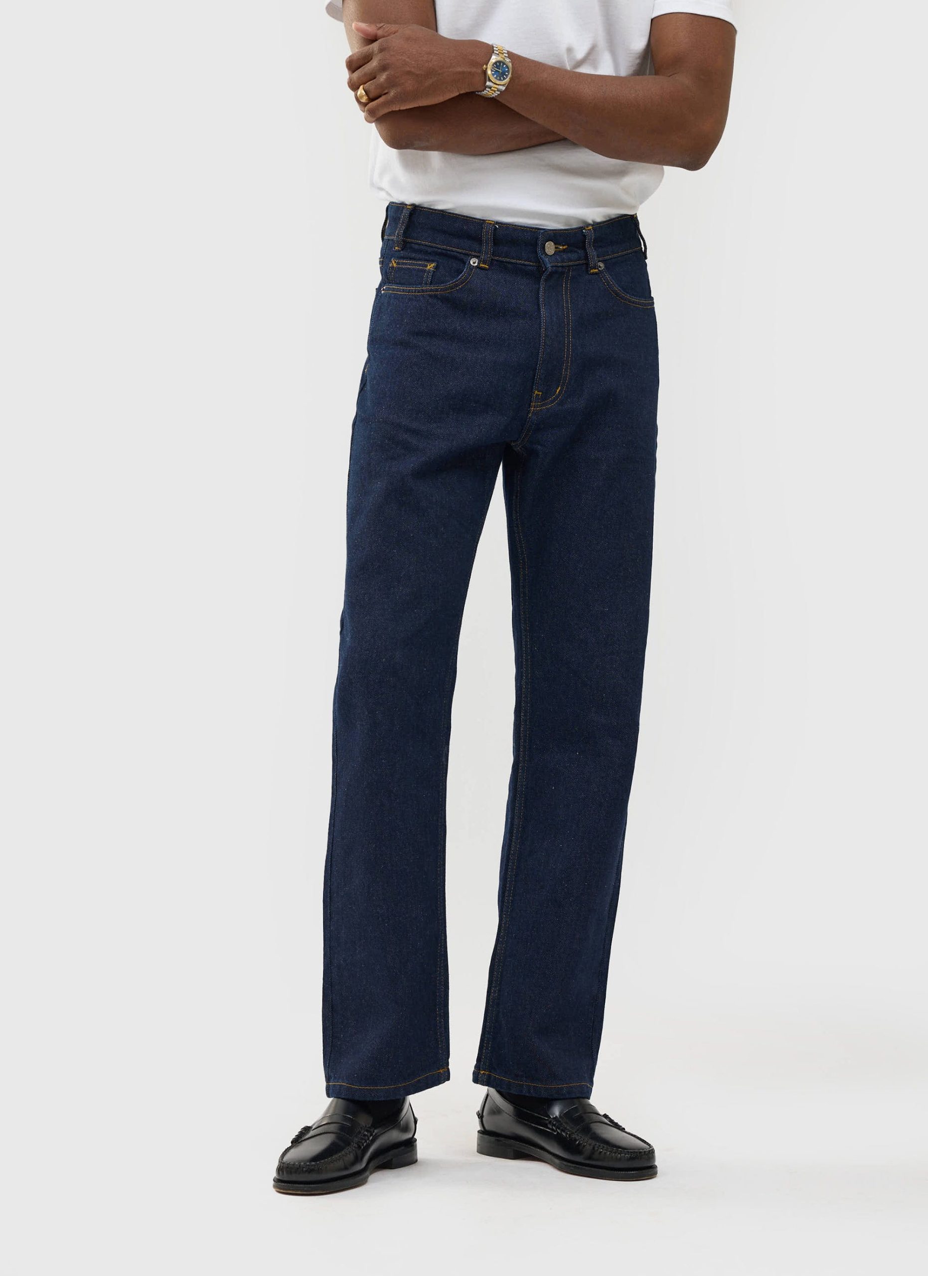 - Features: Men’s jeans in a dark indigo blue. Made from a heavyweight 14oz denim and finished with a branded leather tan back waistband patch, these straight leg jeans are ideal for casual fits.