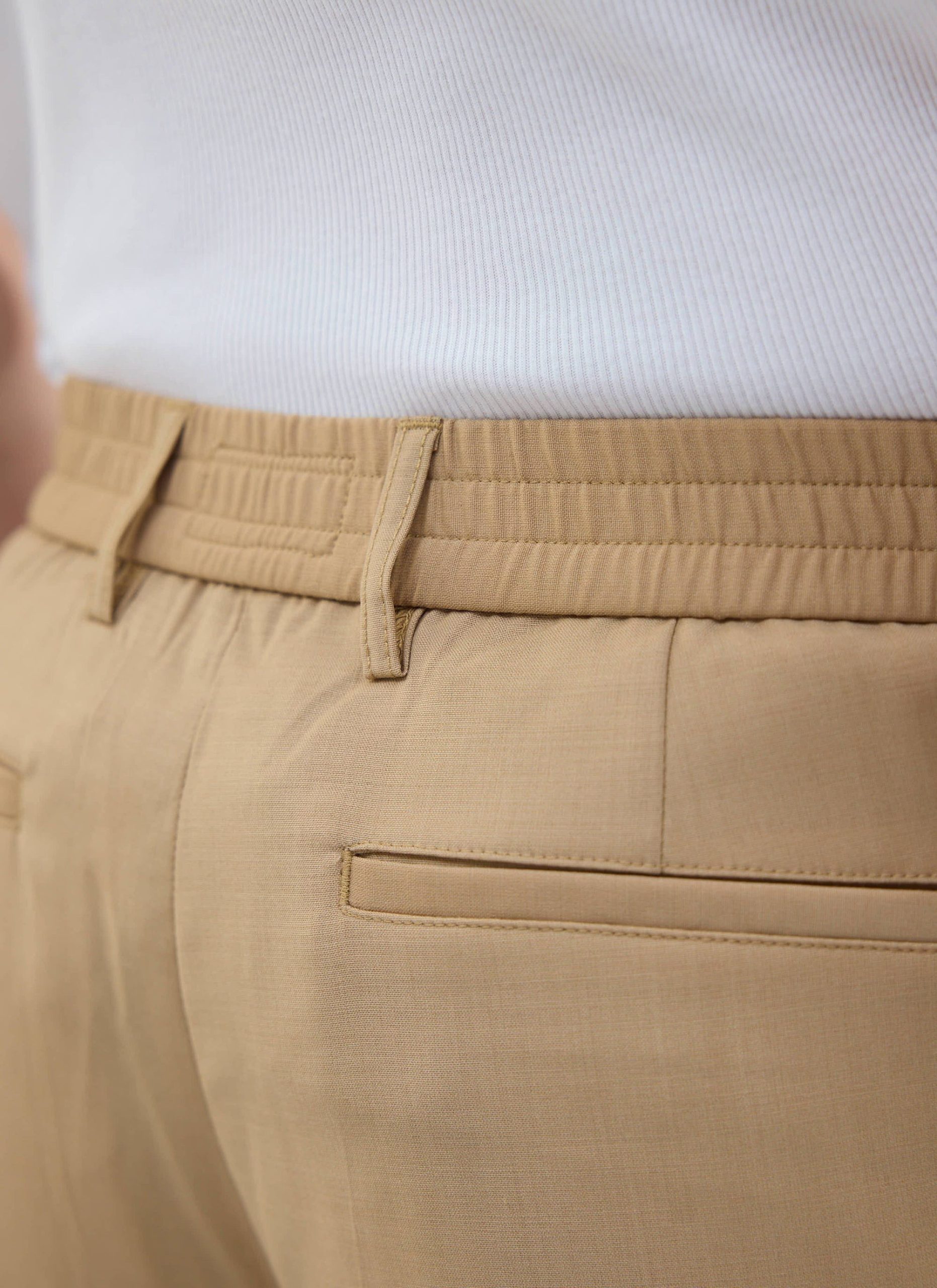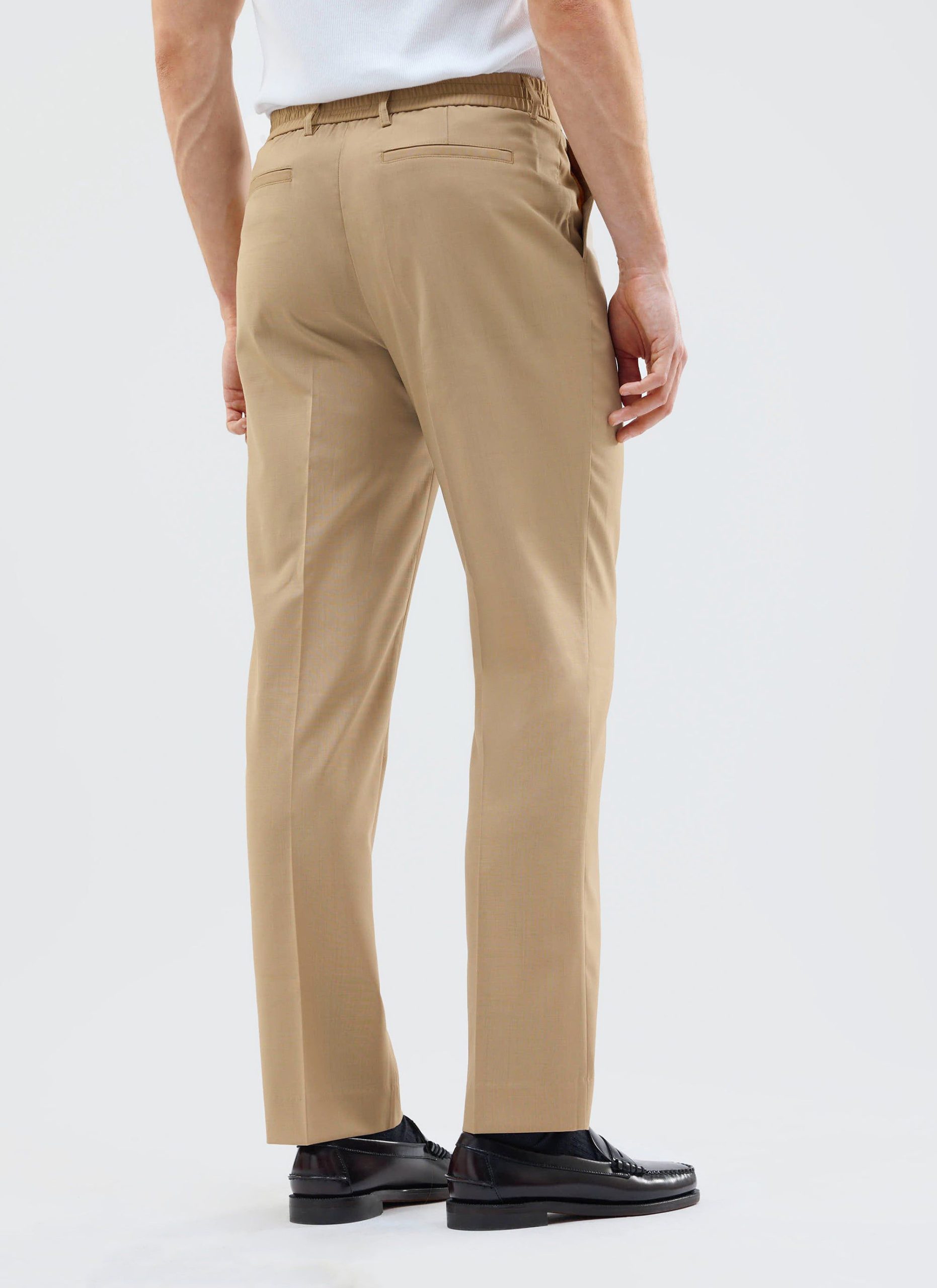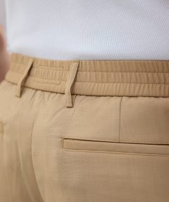 - Features: Men’s pleated tan trousers combine the polished look of smart tailoring with the comfort of joggers, thanks to an elasticated waist. Designed with four pockets for practicality and buckles for belt styling, these tailored trousers offer a roomy fit through the thigh and taper neatly toward the ankle. Perfect for summer and wearable for any occasion, they pair effortlessly with any shoe to keep your style sharp and versatile.