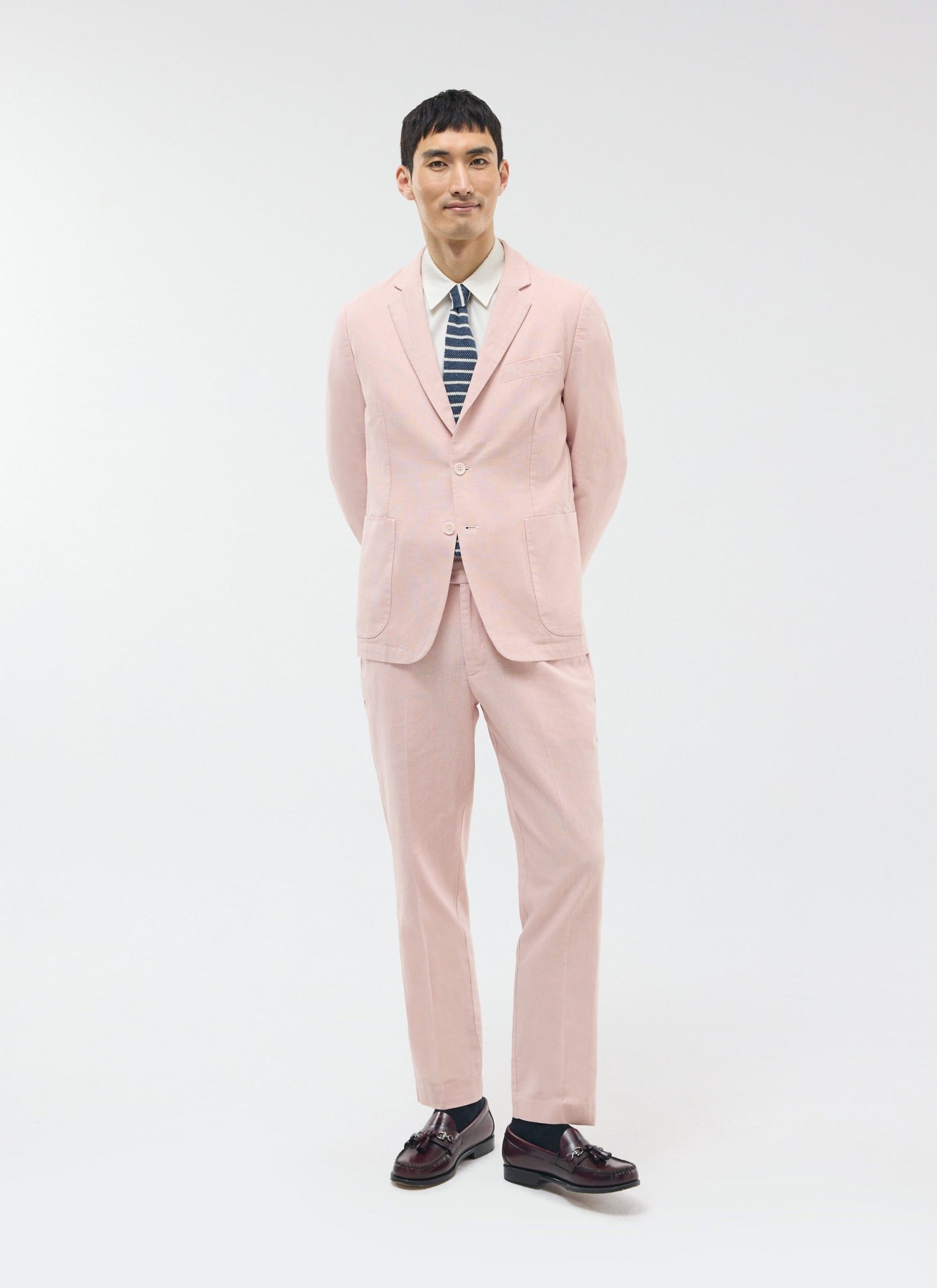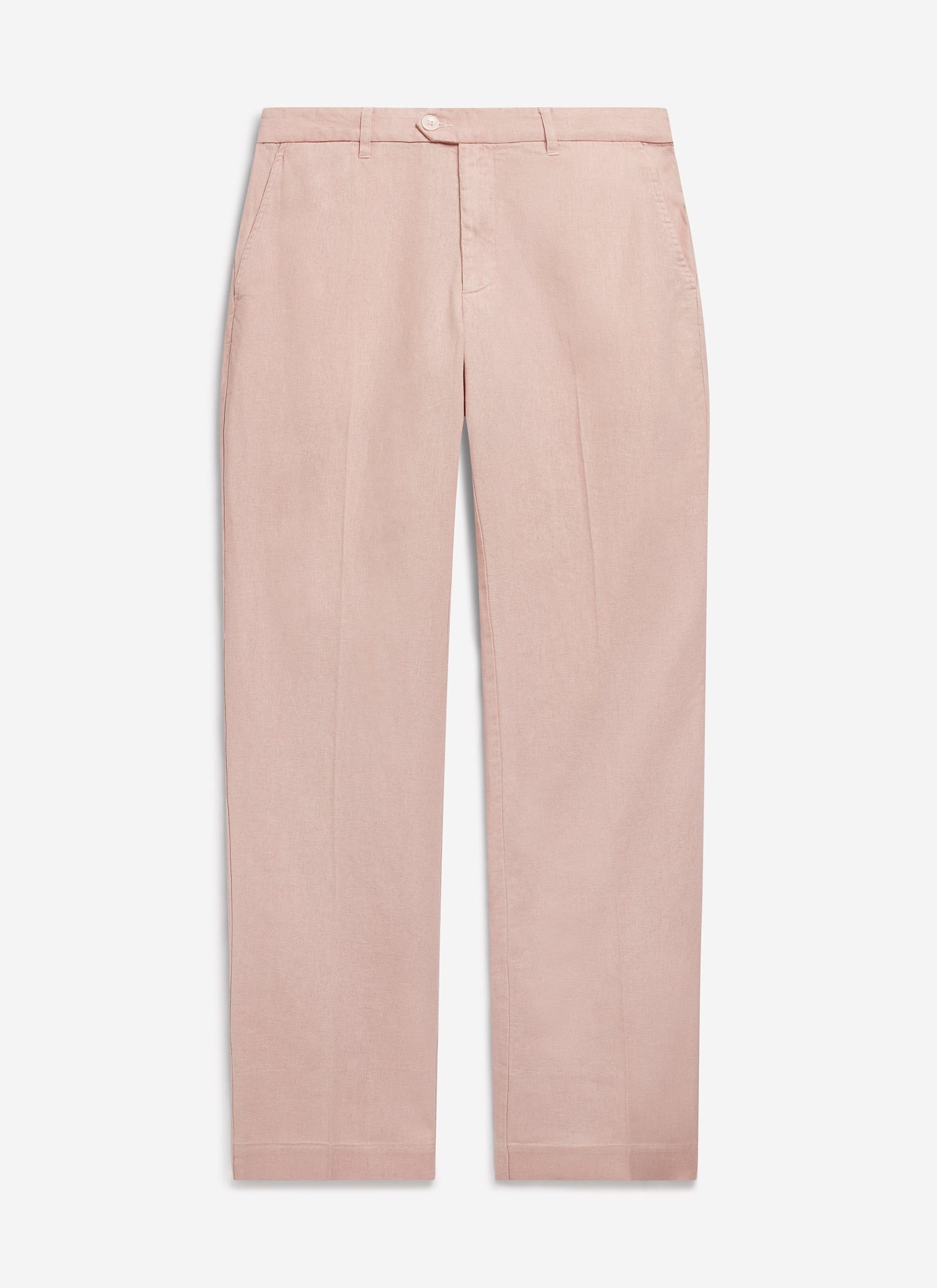 - Features: Men’s Linen Trousers in Pink, crafted from a lightweight linen blend for a breathable and refined look. Designed with a straight-leg fit, these Pink Linen Trousers feature classic tailored details, including a fixed waistband, zip fly, belt loops, back welt pockets, corozo buttons, and a 4.5cm invisible hem turn-up for easy alterations. Available in a range of waist and leg lengths, our Linen Suit Trousers ensure a sophisticated, custom-fit appearance. Ideal for weddings and smart dressing, these linen trousers can be effortlessly styled for any formal or casual occasion.