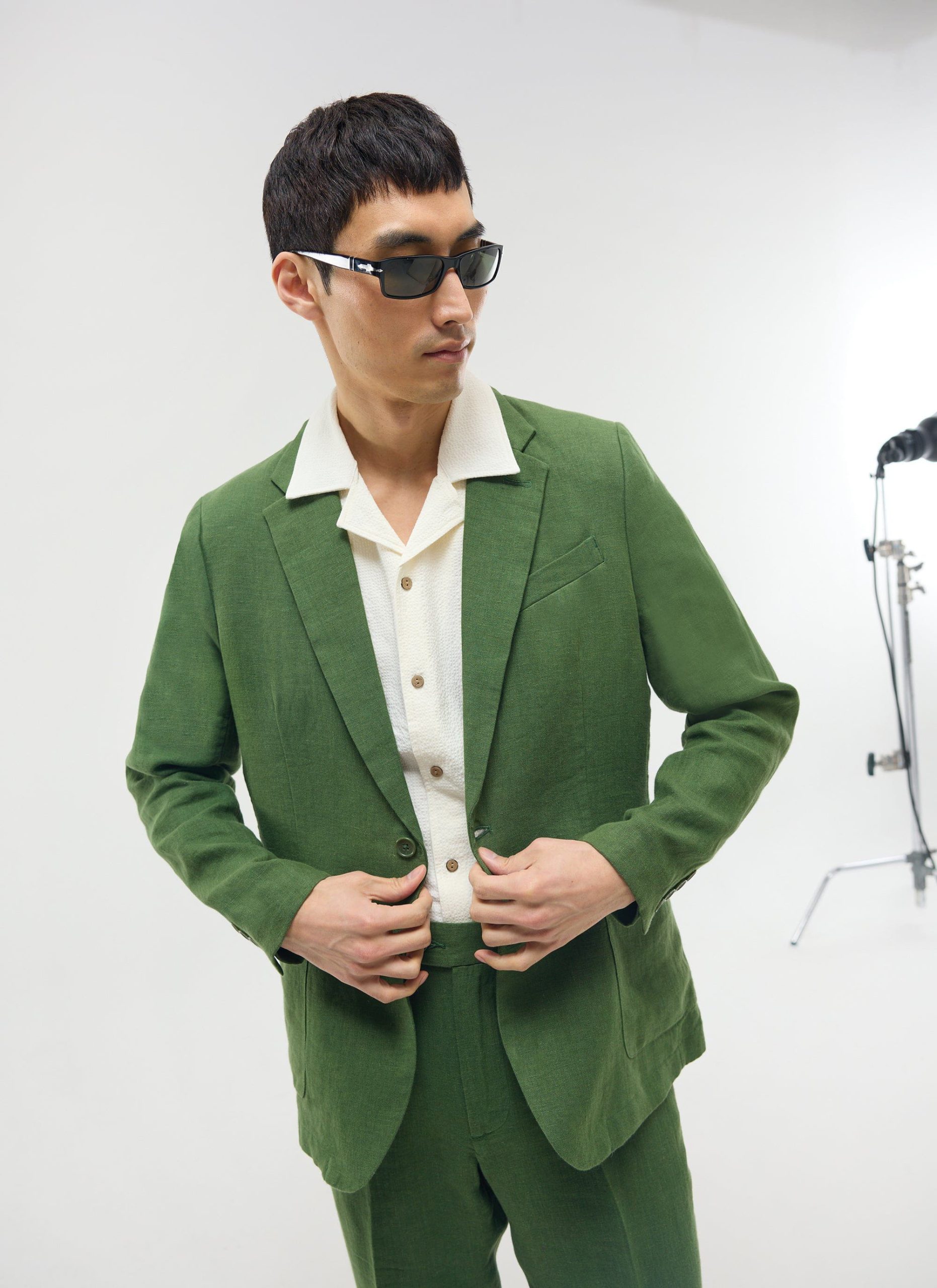 The term blazer first appeared in 1952, used to describe a jacket in a ‘blazing’ red. Percival’s Forest Linen Suit? Still blazing — just in a cooler, more considered hue. Dressing up for getting down, boardroom to beer garden, adapt a persona, or just be yourself — the two-piece has you covered.