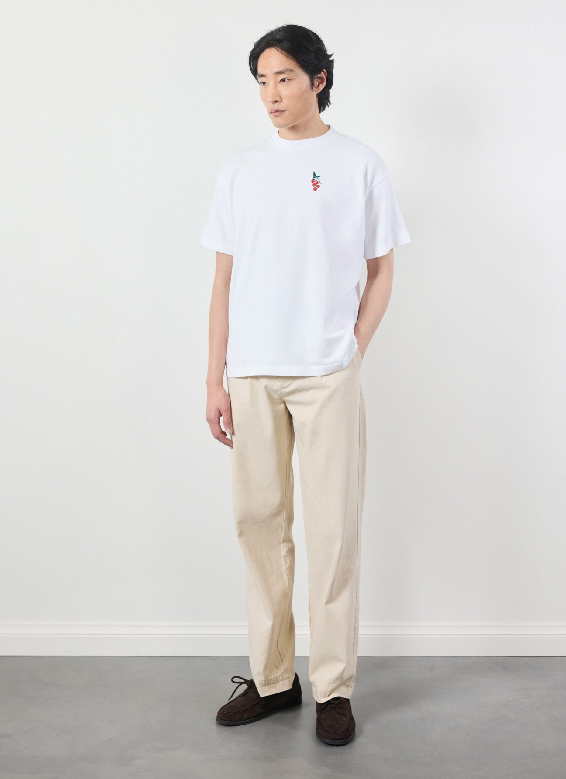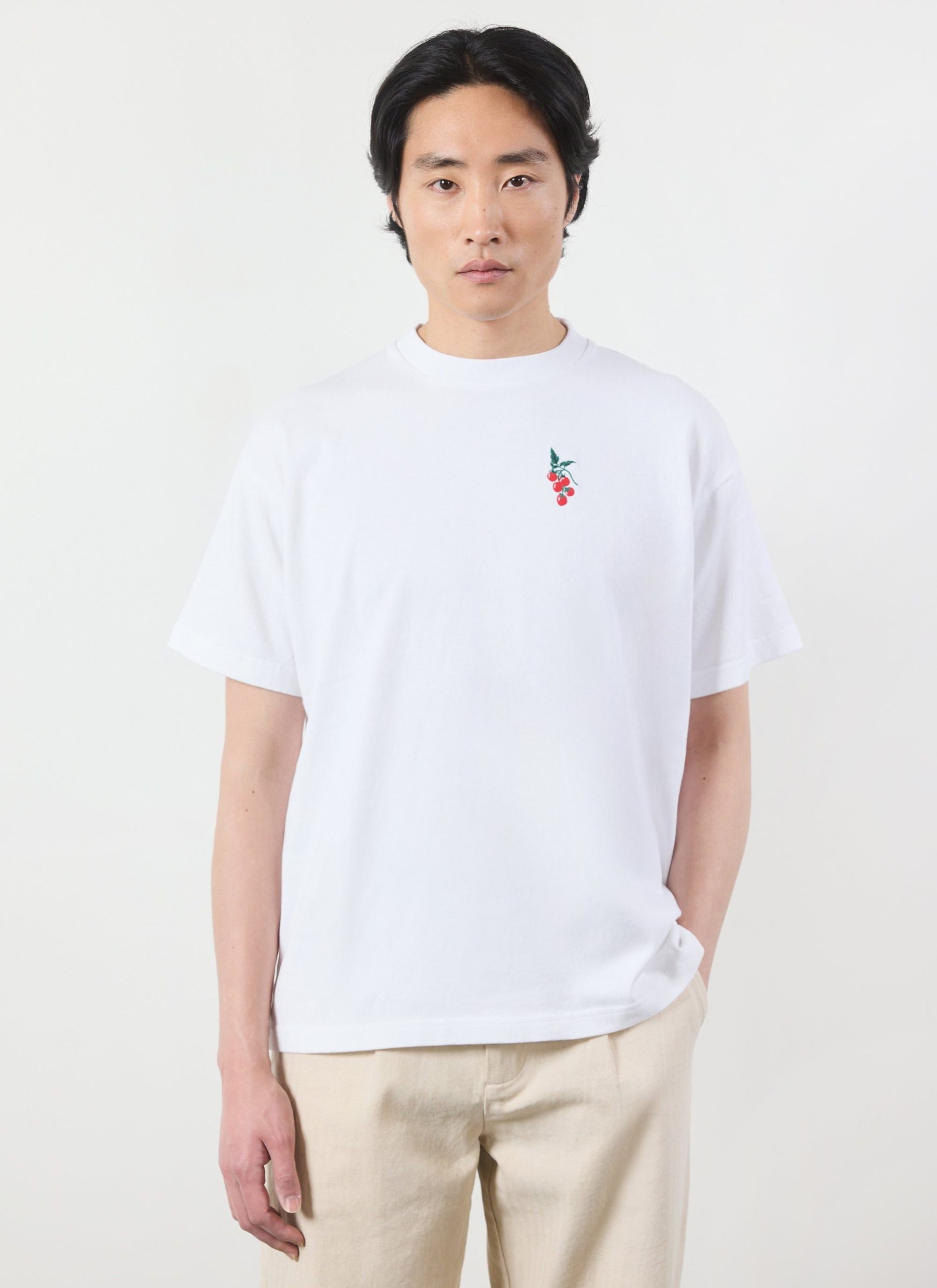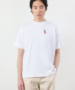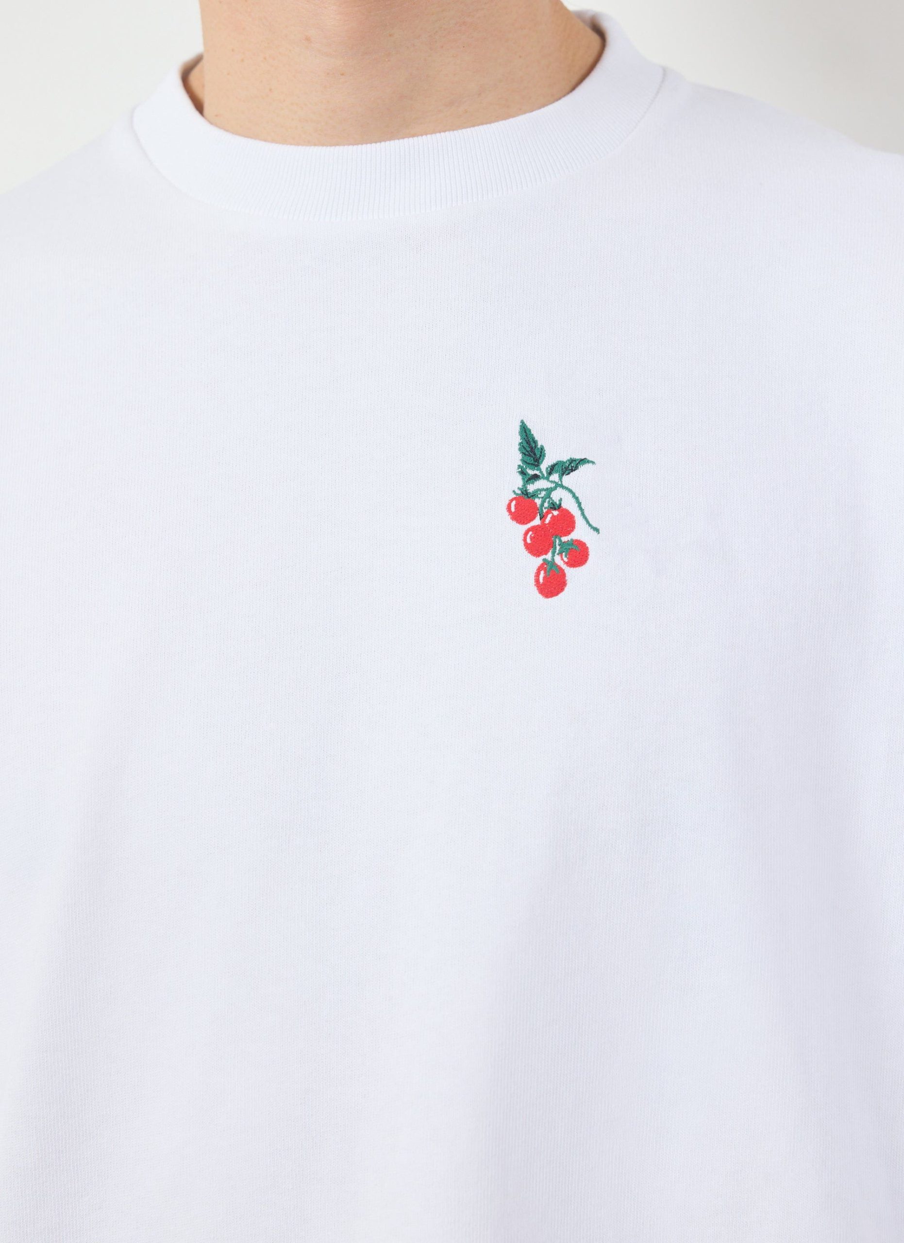 - Features: Men’s Oversized Short Sleeve Shirt in White. Made from organic cotton for a heavyweight feel, it features custom tomato embroidery on the chest and a ribbed neckline for enhanced comfort. This Embroidered T Shirt is perfect for layering and is a wardrobe staple.
