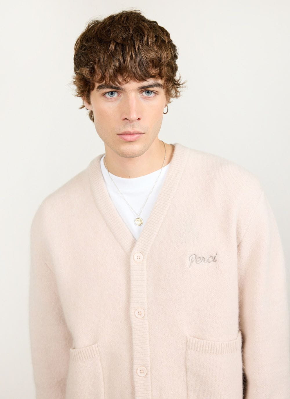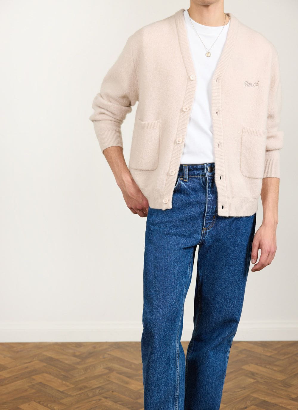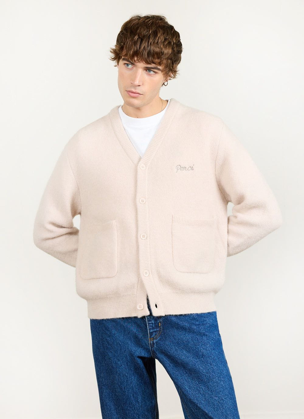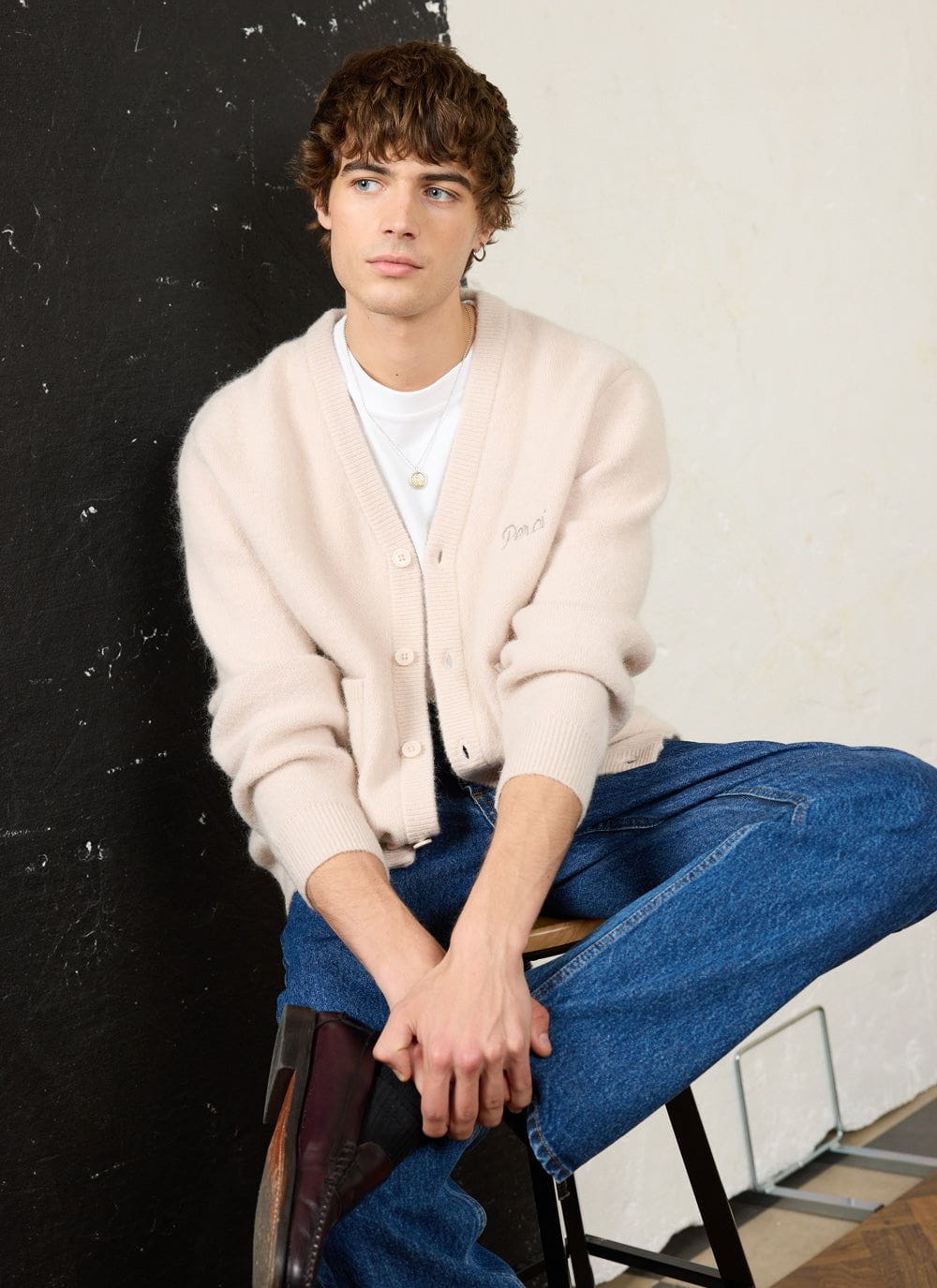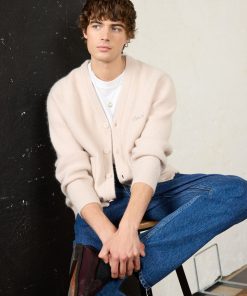 - Features: Men’s cream cardigan made from a soft mohair blend in a relaxed fit. Finished with unique white glove knitted detailing, this mohair cardigan is perfect for layering during cooler months. An elevated take on a wardrobe staple, ideal for casual yet refined styling.